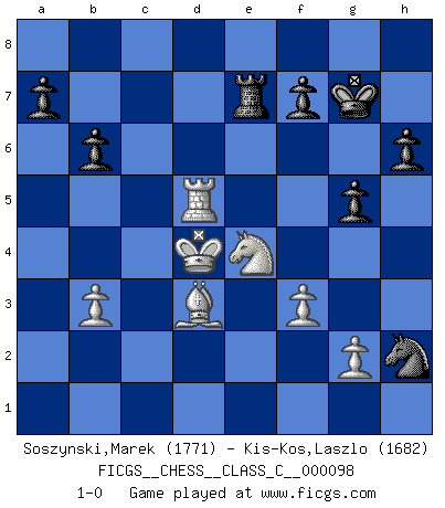 Last move : 1-0 2008 December 6 4:19:17 [Event "FICGS__CHESS__CLASS_C__000098"] [Site "FICGS"] [Date "2008.10.24"] [Round "1"] [White "Soszynski,Marek"] [Black "Kis-Kos,Laszlo"] [Result "1-0"] [WhiteElo "1771"] [BlackElo "1682"] 1.e4 e5 2.d4 exd4 3.Qxd4 Nc6 4.Qe3 Nf6 5.Bd2 Ng4 6.Qg3 d5 7.Nc3 Bd6 8.Bf4 dxe4 9.O-O-O Bxf4+ 10.Qxf4 Qf6 11.Qxe4+ Be6 12.Nh3 O-O 13.Bd3 Qh6+ 14.Rd2 Rad8 15.Qf4 Qxf4 16.Nxf4 Nb4 17.Re1 Bxa2 18.b3 Rfe8 19.Rxe8+ Rxe8 20.Be2 Nxh2 21.Nfd5 Nxd5 22.Rxd5 g6 23.Rd7 Bxb3 24.cxb3 Kf8 25.Rxc7 Re7 26.Rc4 g5 27.Kd2 Rd7+ 28.Ke3 Re7+ 29.Kd4 Kg7 30.Rc5 h6 31.f3 b6 32.Rd5 Rc7 33.Bd3 Re7 34.Ne4 1-0 Centre game : Berger variation Queenside Castling by player White (move 9) Kingside Castling by player Black (move 12) Player White won this chess game. Follow this game move after move (download)We must make sure that Chess will not be like a dead language, very interesting, but for a very small group. (Sytze Faber) Eine Person mit durchschnittlichem IQ kann etwa eine ELO von 2000 erreichen. (Jonathan Levitt) En un gambito tu regalas un Peón por el bién de tomar un juego perdido. (Samuel Standige Boden) Il n'y a pas eu de défaite parce que je ne crois pas que cet ordinateur ait jamais existé. IBM a triché en refusant d'imprimer les modes de recherche de la machine. C'est évident, pendant le match, des coups décisifs ont été joués par des êtres humains. Aujourd'hui, les meilleurs spécialistes en informatique ne peuvent toujours pas expliquer comment Deep-Blue a pu jouer contre la logique des ordinateurs. IBM a gagné une guerre de communication, mais ils sont incapables de prouver que l'ordinateur a gagné tout seul. (Garry Kasparov) You cannot beat a roulette table unless you steal money from it. (Albert Einstein)
