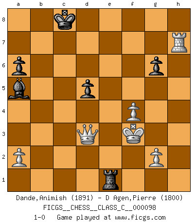 Last move : 1-0 2008 November 4 9:49:58 [Event "FICGS__CHESS__CLASS_C__000098"] [Site "FICGS"] [Date "2008.10.24"] [Round "1"] [White "Dande,Animish"] [Black "D Agen,Pierre"] [Result "1-0"] [WhiteElo "1891"] [BlackElo "1800"] 1.e4 c5 2.Nf3 Nc6 3.d4 cxd4 4.Nxd4 Nf6 5.Nc3 d6 6.Be3 g6 7.Qd2 Qc7 8.Be2 Bg7 9.h4 a6 10.h5 Bd7 11.hxg6 fxg6 12.f4 O-O-O 13.Bc4 Ng4 14.Ne6 Nxe3 15.Nxc7 Nxc4 16.Qe2 Nxb2 17.N7d5 e6 18.Nb6+ Kb8 19.Nxd7+ Rxd7 20.Rh3 Rc8 21.Rb1 Nd4 22.Qg4 Nxc2+ 23.Kd2 Na4 24.Nxa4 Nd4 25.Rb2 Rc6 26.Rxh7 d5 27.exd5 Rxd5 28.Nc3 Nb3+ 29.Ke2 Nc1+ 30.Kf1 Bxc3 31.R2xb7+ Kc8 32.Qf3 Ba5 33.Rbd7 Nd3 34.Rxd5 Rc1+ 35.Ke2 exd5 36.Qxd3 Re1+ 37.Kf3 1-0 Sicilian defense Queenside Castling by player Black (move 12) Player White won this chess game. Follow this game move after move (download)Via the squares on the chessboard, the Indians explain the movement of time and the age, the higher influences which control the world and the ties which link Chess with the human soul. (Al-Masudi) Schach ist die gewalttätigste aller Sportarten. (Garry Kasparov) Una compensación adecuada por un sacrificio es tener una combinación sólida que conduce a una posición ganadora; una compensación adecuada por una metida de pata es dejar a tu oponente arrebatar una derrota de las fauces de la victoria. (Bruce A. Moon) Le profane ne songe pas à la somme de jouissance dont il se prive, qui méconnaît ce jeu aux ressources aussi variées que passionnantes. (Jean-Marie Jeanton-Lamarche) Players are not good because they find tactics, it is about the way to find the positions in which those tactics are hidden. (Luc-Olivier Leclerc)
