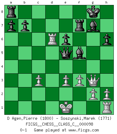 Last move : 0-1 2008 October 29 22:26:1 [Event "FICGS__CHESS__CLASS_C__000098"] [Site "FICGS"] [Date "2008.10.24"] [Round "1"] [White "D Agen,Pierre"] [Black "Soszynski,Marek"] [Result "0-1"] [WhiteElo "1800"] [BlackElo "1771"] 1.d4 c6 2.c4 d5 3.Nf3 g6 4.Nc3 Bg7 5.Bg5 h6 6.Bf4 Nf6 7.e3 O-O 8.Bd3 Nbd7 9.Qc2 dxc4 10.Bxc4 Nb6 11.Bd3 Nfd5 12.Be5 Nb4 13.Qb1 c5 14.Bxg6 fxg6 15.Qxg6 Rf7 16.O-O-O Bf5 17.Qg3 cxd4 18.Bxd4 Qc8 19.Ne5 Nxa2+ 20.Kd2 Nxc3 21.bxc3 Nc4+ 22.Ke2 Nxe5 23.Bxe5 e6 24.Rd6 Qc4+ 25.Ke1 Qb5 26.f3 Qxe5 0-1 Queen's pawn Kingside Castling by player Black (move 7) Queenside Castling by player White (move 16) Player Black won this chess game. Follow this game move after move (download)Do you realize Fischer almost never has any bad pieces? He exchanges them, and the bad pieces remain with his opponents. (Yuri Balashov) Das Schach ist nichts für kleine Geister, es beansprucht einen vollen Mann, der sich nicht sklavisch an das Überlieferte hält, sondern selbständig die Tiefen des Spiels zu ergründen sucht. (Wilhelm Steinitz) Yo considero que Fischer es uno de los expertos mas grandes de aperturas de siempre. (Keith Hayward) Ne tendez aucun piège pour le plaisir ! Ne jouez rien dans l'espoir que l'adversaire réagisse de façon stupide ! Prenez toujours pour acquis que l'adversaire va trouver le meilleur coup ! Ne jouez jamais de coup dans l'espoir que l'adversaire ne voie pas la menace ! Chacun de vos coups doit améliorer la position d'une façon ou d'une autre. The beginning of wisdom is silence. The second step is listening. (Unknown)