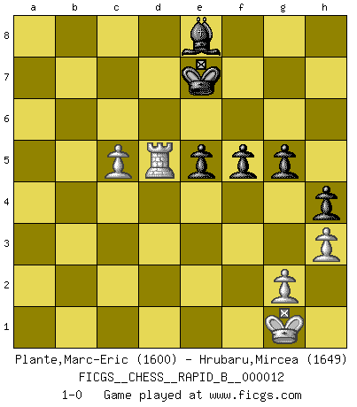 Last move : 1-0 2006 November 19 9:26:55 [Event "FICGS__CHESS__RAPID_B__000012"] [Site "FICGS"] [Date "2006.08.16"] [Round "1"] [White "Plante,Marc-Eric"] [Black "Hrubaru,Mircea"] [Result "1-0"] [WhiteElo "1600"] [BlackElo "1649"] 1.e4 c5 2.Nf3 e6 3.d4 cxd4 4.Nxd4 a6 5.Bd3 Bc5 6.Nb3 Be7 7.Qg4 g6 8.Qe2 d6 9.O-O Nd7 10.c4 Qc7 11.Nc3 b6 12.Be3 Ngf6 13.f4 Bb7 14.Rad1 h5 15.Bd4 O-O 16.Qf3 e5 17.fxe5 Nxe5 18.Qf4 Nfg4 19.Be2 Qd8 20.Bxg4 Bg5 21.Qg3 Bh4 22.Qe3 Nxg4 23.Qe2 Re8 24.Nd2 Rc8 25.h3 Ne5 26.b3 Qc7 27.Na4 b5 28.Nb6 Rb8 29.cxb5 axb5 30.Qxb5 Bc6 31.Qa6 Bg5 32.a4 Bxd2 33.Rxd2 Bxe4 34.a5 Re6 35.Bxe5 dxe5 36.Qc4 Qxc4 37.bxc4 f5 38.Ra1 Rb7 39.Rd7 Rexb6 40.Rd8+ Kf7 41.axb6 Rxb6 42.c5 Rc6 43.Rc1 h4 44.Rh8 g5 45.Rh7+ Ke6 46.Rh5 Kf6 47.Rh6+ Ke7 48.Rxc6 Bxc6 49.Rd1 Be8 50.Rd5 1-0 Sicilian : Kan, Polugaievsky variation Kingside Castling by player White (move 9) Kingside Castling by player Black (move 15) Player White won this chess game. Follow this game move after move (download)Fischer is under obligation to nobody. (Joseph Platz) Man gibt nur Pakete auf. (Paul Keres) Aquellos que dicen que entienden al Ajedrez, no entienden nada. (Robert Hubner) Les ravages du H expliquent la différence de niveau entre Tal et Thal [Abergel]. Ah, the Socrating method. The best way we have of teaching everything-apart from juggling chainsaws. (Gregory House, House M.D.)