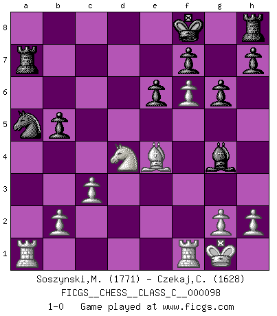 Last move : 1-0 2008 December 15 11:44:50 [Event "FICGS__CHESS__CLASS_C__000098"] [Site "FICGS"] [Date "2008.10.24"] [Round "1"] [White "Soszynski,Marek"] [Black "Czekaj,Christophe"] [Result "1-0"] [WhiteElo "1771"] [BlackElo "1628"] 1.e4 g6 2.d4 d6 3.Nc3 Bg7 4.f4 Nf6 5.e5 dxe5 6.fxe5 Nd5 7.Nf3 Bg4 8.Bc4 e6 9.Ne4 Nc6 10.c3 Na5 11.Bb5+ Kf8 12.Bg5 Qc8 13.O-O a6 14.Bd3 b5 15.Nf6 Bxf6 16.Bxf6 Nxf6 17.exf6 c5 18.Be4 Ra7 19.a4 Qc7 20.axb5 axb5 21.dxc5 Qxc5+ 22.Qd4 Qxd4+ 23.Nxd4 1-0 Robatsch (Modern) defense Kingside Castling by player White (move 13) Player White won this chess game. Follow this game move after move (download)There are tough players and nice guys, and I'm a tough player. (Bobby Fischer) Es genügt nicht ein guter Spieler zu sein, man muß auch gut spielen. (Siegbert Tarrasch) El Ajedrez tiene tanto misterio como las mujeres. (Purdy) Les échecs, c'est l'art d'analyser. (Mikhail Botvinnik) Life is like a play: it's not the length but the excellence of the acting that matters. (Seneca)