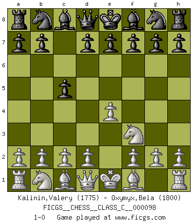 Last move : 1-0 2008 December 14 2:34:0 [Event "FICGS__CHESS__CLASS_C__000098"] [Site "FICGS"] [Date "2008.10.24"] [Round "1"] [White "Kalinin,Valery"] [Black "Oxymyx,Bela"] [Result "1-0"] [WhiteElo "1775"] [BlackElo "1800"] 1.e4 c5 2.Nf3 1-0 This chess game has been lost on time (started : 2008.10.24 0:47:55) Sicilian defense Player White won this chess game. Follow this game move after move (download)A win by an unsound combination, however showy, fills me with artistic horror. (Wilhelm Steinitz) Viele Opfer benötigen überhaupt keine konkrete Berechnung. Es genügt sich die entstehende Position kurz vorzustellen, um uns davon zu überzeugen, dass das Opfer korrekt ist. (Mikhail Nekhemyevich Tal) Mi estilo es algo parecido entre un poco de Tal y Petrosian. (Reshevsky) À la honte des hommes, on sait que les lois du jeu sont les seules qui soient partout justes, claires, inviolables et exécutées. Pourquoi l'Indien qui a donné les règles du jeu d'échecs est-il obéi de bon gré dans toute la terre, et que les décrétales des papes, par exemple, sont aujourd'hui un objet d'horreur et de mépris ? C'est que l'inventeur des échecs combina tout avec justesse pour la satisfaction des joueurs, et que les papes, dans leurs décrétales, n'eurent en vue que leur seul avantage. L'Indien voulut exercer également l'esprit des hommes et leur donner du plaisir; les papes ont voulu abrutir l'esprit des hommes. Voltaire (Dictionnaire philosophique / Garnier 1967) You think that education is too expensive ? Try ignorance. (Derek Bok)