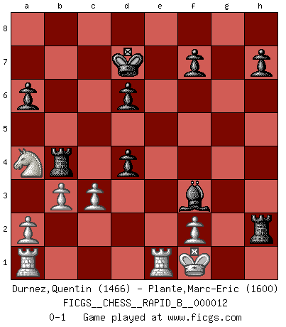 Last move : 0-1 2006 September 1 16:12:19 [Event "FICGS__CHESS__RAPID_B__000012"] [Site "FICGS"] [Date "2006.08.16"] [Round "1"] [White "Durnez,Quentin"] [Black "Plante,Marc-Eric"] [Result "0-1"] [WhiteElo "1466"] [BlackElo "1600"] 1.e4 c5 2.Nf3 d6 3.d4 cxd4 4.Nxd4 Nf6 5.Nc3 a6 6.Bc4 e6 7.Qf3 Nbd7 8.O-O b5 9.Bb3 Bb7 10.Re1 b4 11.Na4 Ne5 12.Qf4 Rc8 13.Bd2 Nc4 14.Bxb4 e5 15.Qg3 exd4 16.Bxc4 Rxc4 17.e5 Rxb4 18.exf6 Kd7 19.fxg7 Bxg7 20.Qxg7 Qg8 21.Qxg8 Rxg8 22.b3 Rxg2+ 23.Kf1 Bf3 24.c3 Rxh2 0-1 Sicilian : Najdorf, Lipnitzky attack Kingside Castling by player White (move 8) Player Black won this chess game. Follow this game move after move (download)I like the moment when I break a man's ego. (Bobby Fischer) Es gibt Leute, die glauben, alles wäre vernünftig, was man mit einem ernsthaften Gesicht tut. (Georg Christoph Lichtenberg) El Ajedrez es un regaderazo frío para la mente. (Sir John Simon) J'apprécie les joueurs d'est-indienne, c'est grâce à eux que je nourris ma famille depuis tant d'années. (Petrosian) There are more things in heaven and earth than practically anywhere else. (Unknown)