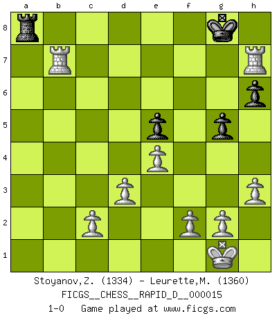 Last move : 1-0 2008 November 5 17:50:44 [Event "FICGS__CHESS__RAPID_D__000015"] [Site "FICGS"] [Date "2008.10.25"] [Round "1"] [White "Stoyanov,Zdravko"] [Black "Leurette,Marc-Antoine"] [Result "1-0"] [WhiteElo "1334"] [BlackElo "1360"] 1.e4 e5 2.Nf3 Nc6 3.Bb5 Nf6 4.Bxc6 dxc6 5.d3 Bb4+ 6.Bd2 c5 7.Bxb4 cxb4 8.h3 O-O 9.Nxe5 c5 10.Nd2 b6 11.Qf3 a5 12.O-O Qd4 13.Nec4 Nd7 14.Nb3 Qf6 15.Qxf6 Nxf6 16.Nxb6 Rb8 17.Nc4 a4 18.Nxc5 a3 19.bxa3 bxa3 20.Nxa3 Be6 21.Nxe6 fxe6 22.Rab1 e5 23.Nc4 Rfe8 24.Rb3 Ra8 25.a3 h6 26.Rfb1 g5 27.Rb7 Rec8 28.Nb6 Nh7 29.Nxa8 Rxa8 30.Re7 Rxa3 31.R1b7 Ra8 32.Rxh7 1-0 Ruy Lopez : Berlin defense Kingside Castling by player Black (move 8) Kingside Castling by player White (move 12) Player White won this chess game. Follow this game move after move (download)Blessed be the memory of him who gave the world this immortal game. (A. G. Gardiner) Es ist nicht das erste mal, dass sich die FIDE dem Arabischen Geld gebeugt hat (über die FIDE WM 2004 in Lybien). (Larry Evans) No es tiempo de jugar al Ajedrez cuando la casa esta en llamas. (Proverbio Italiano) Nous vivons dans un monde échiquéen : chaque jour qui passe est un défi à relever. (Philosophe Sasha) Don't be discouraged. It's often the last key in the bunch that opens the lock. (Author unknown)