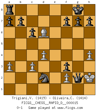 Last move : 0-1 2009 January 8 11:14:5 [Event "FICGS__CHESS__RAPID_D__000015"] [Site "FICGS"] [Date "2008.10.25"] [Round "1"] [White "Trigiani,Vincenzo"] [Black "Oliveira,Carlos"] [Result "0-1"] [WhiteElo "1419"] [BlackElo "1414"] 1.d4 Nf6 2.Bf4 c6 3.Nc3 d5 4.Nf3 e6 5.e3 Bb4 6.a3 Bxc3+ 7.bxc3 O-O 8.Bd3 Nbd7 9.c4 Qa5+ 10.Ke2 Ne4 11.Re1 Nc3+ 12.Kf1 Nxd1 13.Rexd1 Nf6 14.cxd5 exd5 15.Kg1 Bg4 16.Bd6 Bxf3 17.gxf3 Rfe8 18.e4 dxe4 19.Bc4 exf3 20.Re1 Rxe1+ 21.Rxe1 Qxe1+ 22.Bf1 Ne4 23.h4 Nd2 24.c3 Qxf1+ 25.Kh2 Qg2+ 0-1 Queen's pawn game Kingside Castling by player Black (move 7) Player Black won this chess game. Follow this game move after move (download)There is only one thing Fischer does in Chess without pleasure: to lose ! (Boris Spassky) Der Partner hat auch seine Existenzberechtigung. (Savielly Grigorievitsch Tartakower) Mi estilo es algo parecido entre un poco de Tal y Petrosian. (Reshevsky) Lorsque vous vous retrouvez devant une position atroce, ne tendez pas un ultime piège dérisoire avec l'intention d'abandonner si l'adversaire le déjoue ! Faites-vous plutôt un devoir de résister comme si votre vie en dépendait. Jouez le coup qui vous déplairait au centuple si vous étiez dans la peau de votre tortionnaire ! It is a good thing for an uneducated man to read books of quotations. (Winston Churchill)
