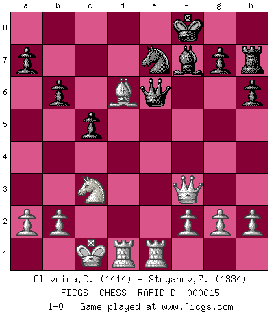 Last move : 1-0 2008 November 29 20:16:34 [Event "FICGS__CHESS__RAPID_D__000015"] [Site "FICGS"] [Date "2008.10.25"] [Round "1"] [White "Oliveira,Carlos"] [Black "Stoyanov,Zdravko"] [Result "1-0"] [WhiteElo "1414"] [BlackElo "1334"] 1.e4 c5 2.c3 e5 3.d4 exd4 4.Nf3 dxc3 5.Nxc3 b6 6.Bc4 d6 7.Qd5 Be6 8.Qxa8 Bxc4 9.Bf4 h6 10.O-O-O f6 11.e5 fxe5 12.Nxe5 Be6 13.Ng6 Rh7 14.Nxf8 Kxf8 15.Bxd6+ Ne7 16.Bxb8 Qc8 17.Qf3+ Bf7 18.Bd6 Qe6 19.Rhe1 1-0 Sicilian : Alapin's variation (2.c3) Queenside Castling by player White (move 10) Player White won this chess game. Follow this game move after move (download)Why must I lose to this idiot ? (Aron Nimzovich) Ohne ihre Erfolge schmälern zu wollen würde ich sagen Petrosian, Spassky und Karpov verdanken ihre Siege ihren Trainern - Boleslavsky, Bondarevsky und Furman. (Mikhail Moiseyevich Botvinik) Desconfianza es la característica mas necesaria de un jugador de Ajedrez. (Siegbert Tarrasch) Des idées, des idées, j'en ai cent, j'en ai mille. Des bonnes, des mauvaises, applicables, irréalisables... Il suffit de faire le tri ! (Roos) Philosophers use a language that is already deformed as though by shoes that are too tight. (Ludwig Wittgenstein)