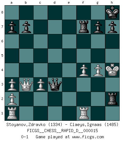 Last move : 0-1 2008 November 4 18:49:52 [Event "FICGS__CHESS__RAPID_D__000015"] [Site "FICGS"] [Date "2008.10.25"] [Round "1"] [White "Stoyanov,Zdravko"] [Black "Claeys,Ignaas"] [Result "0-1"] [WhiteElo "1334"] [BlackElo "1485"] 1.e4 d5 2.e5 Bf5 3.Nf3 c5 4.d4 e6 5.c3 Nc6 6.Bb5 Qb6 7.Na3 cxd4 8.Nxd4 Bxa3 9.bxa3 Nge7 10.Be3 Qc7 11.Bf4 O-O 12.O-O Ng6 13.Bg3 Rfc8 14.Nxf5 exf5 15.e6 f4 16.Bxc6 fxg3 17.Bxd5 gxh2+ 18.Kh1 Ne5 19.f4 Nc4 20.Qa4 Nb6 21.exf7+ Kh8 22.Qe4 Nxd5 23.Qxd5 Rf8 24.Kxh2 Rxf7 25.g3 Rd8 26.Qb3 Rd2+ 27.Kh3 Qd7+ 28.g4 Qd3+ 29.Kh4 Rh2+ 0-1 Scandinavian (centre counter) defense Kingside Castling by player Black (move 11) Kingside Castling by player White (move 12) Player Black won this chess game. Follow this game move after move (download)Chess is as much a mystery as women. (Purdy) Eine Person mit durchschnittlichem IQ kann etwa eine ELO von 2000 erreichen. (Jonathan Levitt) Tu sabes que vas a perder. Aún cuando tenía la ventaja, yo sabía que iba a perder. - al estar jugando con Fischer (Andrew Soltis) Toute estimation doit être constamment réévaluée. (Jacob Estrin) Animated gif is worth one mega-word. (Unknown)