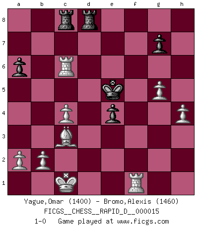 Last move : 1-0 2008 December 2 6:42:35 [Event "FICGS__CHESS__RAPID_D__000015"] [Site "FICGS"] [Date "2008.10.25"] [Round "1"] [White "Yague,Omar"] [Black "Bromo,Alexis"] [Result "1-0"] [WhiteElo "1400"] [BlackElo "1460"] 1.d4 d5 2.e3 Nf6 3.Nf3 Nc6 4.Nc3 Bg4 5.h3 Bh5 6.g4 Bg6 7.Bb5 a6 8.Bxc6+ bxc6 9.Ne5 Qd6 10.h4 h6 11.Nxg6 fxg6 12.f4 e6 13.Qd3 Kd8 14.Qxg6 c5 15.dxc5 Qxc5 16.g5 hxg5 17.fxg5 Ne4 18.Nxe4 dxe4 19.Qxe4 Qd5 20.Qxd5+ exd5 21.Bd2 Bd6 22.Bc3 Rg8 23.O-O-O c6 24.e4 Kd7 25.Rhf1 dxe4 26.Bb4 Ke6 27.Rxd6+ Ke5 28.Rxc6 Rgd8 29.c4 Rac8 30.Bc3+ 1-0 Queen's pawn game Queenside Castling by player White (move 23) Player White won this chess game. Follow this game move after move (download)Life is a kind of Chess, with struggle, competition, good and ill events. (Benjamin Franklin) Man gibt nur Pakete auf. (Paul Keres) Un buen jugador siempre tiene buena suerte. (José Raúl Capablanca) Les sacrifices démontrent seulement que quelqu'un a gaffé. (Savielly Tartacover) Life is like internet, nothing interesting, but noone want to leave it. (Ilmars Cirulis)