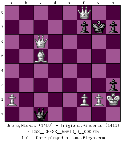 Last move : 1-0 2009 January 6 10:46:32 [Event "FICGS__CHESS__RAPID_D__000015"] [Site "FICGS"] [Date "2008.10.25"] [Round "1"] [White "Bromo,Alexis"] [Black "Trigiani,Vincenzo"] [Result "1-0"] [WhiteElo "1460"] [BlackElo "1419"] 1.e4 e5 2.Nf3 Bc5 3.Nxe5 Nf6 4.Nc3 d6 5.Nf3 Ng4 6.d4 Bxd4 7.Nxd4 Ne5 8.h3 O-O 9.Bd3 Nbc6 10.Nxc6 bxc6 11.O-O Nxd3 12.cxd3 d5 13.Be3 Re8 14.exd5 cxd5 15.d4 Qh4 16.Qf3 Rb8 17.Nxd5 c6 18.Nf4 Rxb2 19.Qxc6 Rf8 20.Rfb1 Rxb1+ 21.Rxb1 Bf5 22.Rb7 Qd8 23.d5 Qh4 24.Rxa7 Bxh3 25.Ra8 g5 26.Nxh3 Kg7 27.Rxf8 Kxf8 28.Bc5+ Kg7 29.d6 Qc4 30.d7 Qc1+ 31.Kh2 g4 32.d8Q gxh3 33.Qf8+ 1-0 King's knight Opening Kingside Castling by player Black (move 8) Kingside Castling by player White (move 11) Promotion Queen by player White (move 32) Player White won this chess game. Follow this game move after move (download)Openings teach you openings. Endgames teach you chess ! (Stephan Gerzadowicz) Schach ist die gewalttätigste aller Sportarten. (Garry Kasparov) Yo no creo en la psicología. Yo creo en las buenas movidas. (Bobby Fischer) Karpov est une pièce de musée. (Garry Kasparov) Luck has a peculiar habit of favoring those who don't depend on it. (Author unknown)