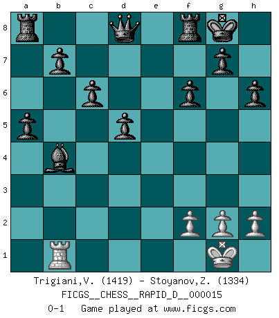 Last move : 0-1 2008 November 29 23:30:4 [Event "FICGS__CHESS__RAPID_D__000015"] [Site "FICGS"] [Date "2008.10.25"] [Round "1"] [White "Trigiani,Vincenzo"] [Black "Stoyanov,Zdravko"] [Result "0-1"] [WhiteElo "1419"] [BlackElo "1334"] 1.d4 c6 2.Nc3 e6 3.Bf4 d5 4.e3 h6 5.Nf3 Nf6 6.Qd3 Qa5 7.Be2 Bb4 8.e4 Nxe4 9.Qe3 Nxc3 10.O-O Nxe2+ 11.Qxe2 Nd7 12.a3 Be7 13.c3 O-O 14.Ne5 Nxe5 15.Bxe5 Qd8 16.Qg4 f6 17.Bf4 e5 18.Qg3 exf4 19.Qxf4 Bd6 20.b4 Bxf4 21.Rae1 Bd2 22.Rd1 Bxc3 23.Rc1 Bxd4 24.Rcd1 Bb2 25.Rfe1 Bxa3 26.Rd3 Bxb4 27.Rb1 Bf5 28.R3d1 Bxb1 29.Rxb1 a5 0-1 Queen's pawn Kingside Castling by player White (move 10) Kingside Castling by player Black (move 13) Player Black won this chess game. Follow this game move after move (download)When I asked Fischer why he had not played a certain move in our game, he replied: 'Well, you laughed when I wrote it down !' (Mikhail Tal) Im Leben werden Partien nie so unstrittig gewonnen wie im Spiel (Emanuel Lasker) No es tiempo de jugar al Ajedrez cuando la casa esta en llamas. (Proverbio Italiano) L'action d'une oeuvre littéraire se déroule sur un champ de bataille. Les masques et les types du drame moderne correspondent aux pièces du jeu d'échecs. L'intrigue correspond aux coups et aux gambits, c'est à dire aux techniques du jeu telles qu'utilisées et interprétées par les joueurs. Les tactiques et les péripéties [mouvements] correspondent aux coups exécutés par l'adversaire. (Viktor Shklovsky) It's not the will to win, but the will to prepare to win that makes the difference. (Bear Bryant)