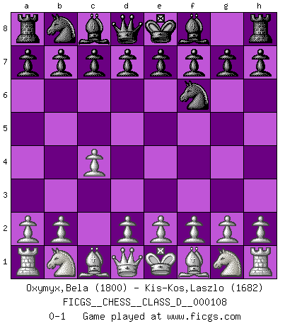 Last move : 0-1 2008 December 5 22:50:55 [Event "FICGS__CHESS__CLASS_D__000108"] [Site "FICGS"] [Date "2008.10.26"] [Round "1"] [White "Oxymyx,Bela"] [Black "Kis-Kos,Laszlo"] [Result "0-1"] [WhiteElo "1800"] [BlackElo "1682"] 1.c4 Nf6 0-1 This chess game has been lost on time (started : 2008.10.26 12:44:42) English, 1...Nf6 (Anglo-Indian defense) Player Black won this chess game. Follow this game move after move (download)Alekhine is a poet who creates a work of art out of something that would hardly inspire another man to send home a picture post card. (Max Euwe) Ich glaube, ich kenne inzwischen die Gründe für mein Versagen: schachliche Charakterfehler. Ich war nie ein Wunderkind und in meiner gesamten menschlichen Entwicklung immer zu langsam. (Viktor Kortschnoi) Si no le temes a Spassky, entonces elimino el elemento del dinero. (Jim Slater) Donnez-moi un Cavalier en 6e et je gagnerais toutes mes parties. (Steinitz) I just play for fun. (Anna Kournikova)