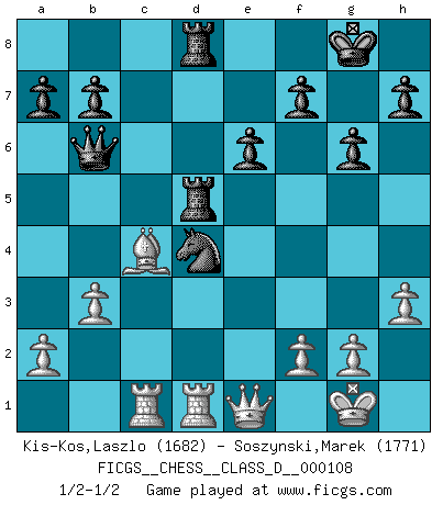 Last move : 1/2-1/2 2008 December 6 4:18:33 [Event "FICGS__CHESS__CLASS_D__000108"] [Site "FICGS"] [Date "2008.10.26"] [Round "1"] [White "Kis-Kos,Laszlo"] [Black "Soszynski,Marek"] [Result "1/2-1/2"] [WhiteElo "1682"] [BlackElo "1771"] 1.e4 c6 2.d4 d5 3.Nc3 g6 4.Nf3 Bg7 5.exd5 cxd5 6.Bf4 Nf6 7.Bd3 O-O 8.O-O Bg4 9.h3 Bxf3 10.Qxf3 Nc6 11.Ne2 Nh5 12.Bg5 Nxd4 13.Nxd4 Bxd4 14.Rae1 Bf6 15.Bh6 Bg7 16.Bxg7 Nxg7 17.c4 dxc4 18.Bxc4 Qc7 19.Rc1 Qb6 20.Rfd1 Nf5 21.b3 Rad8 22.Qe4 e6 23.Bd3 Rd7 24.Be2 Nd4 25.Bb5 Rd6 26.Bf1 Rfd8 27.Qe1 Rd5 28.Bc4 Nc2 29.Qe2 Nd4 30.Qe1 R5d7 31.Bf1 Rd5 32.Bc4 1/2-1/2 Caro-Kann : Gurgenidze system Kingside Castling by player Black (move 7) Kingside Castling by player White (move 8) This chess game ended in a draw. Follow this game move after move (download)The tactician knows what to do when there is something to do; whereas the strategian knows what to do when there is nothing to do. (Gerald Abrahams) Mit sehr nachdenklichem Gesicht schreitet Bobby durch den Turniersaal. Was ist passiert?, fragt Lombardy. Ich stehe schlecht, antwortet Fischer. Lombardy: Dann biete doch einfach Remis an. Fischer: So schlecht stehe ich nun auch wieder nicht! (Robert James Fischer) La táctica fluye a partir de una posición superior. (Bobby Fischer) Celui qui prend des risques peut perdre, celui qui n'en prend pas perd toujours. (Xavier Tartacover) Perfection is achieved, not when there is nothing more to add, but when there is nothing left to take away. (Antoine de Saint-Exupéry)