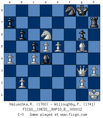 Last move : 1-0 2006 October 10 18:19:0 [Event "FICGS__CHESS__RAPID_B__000012"] [Site "FICGS"] [Date "2006.08.16"] [Round "1"] [White "Haluschka,Rainer"] [Black "Willoughby,Peter"] [Result "1-0"] [WhiteElo "1700"] [BlackElo "1741"] 1.d4 e6 2.c4 c5 3.d5 Nf6 4.Nf3 d6 5.Nc3 Be7 6.e4 e5 7.Bd3 Bg4 8.O-O O-O 9.h3 Bxf3 10.Qxf3 Nbd7 11.a4 b6 12.Bd2 Ne8 13.Qg3 Bh4 14.Qg4 h6 15.Bxh6 Bf6 16.Be2 Kh7 17.Be3 Rh8 18.Qf5+ g6 19.Qg4 Bg7 20.Bg5 Nef6 21.Qg3 Qc7 22.f4 exf4 23.Rxf4 Kg8 24.Raf1 Nh5 25.Bxh5 Rxh5 26.Rxf7 Rf8 27.Nb5 Qc8 28.Nxd6 Bd4+ 29.Kh1 Rh7 30.Rxf8+ Qxf8 31.Rxf8+ Nxf8 32.e5 1-0 Queen's pawn Kingside Castling by player White (move 8) Kingside Castling by player Black (move 8) Player White won this chess game. Follow this game move after move (download)One doesn't have to play well, it's enough to play better than your opponent. (Siegbert Tarrasch) Bis zum Jahr 1971 verlief in meiner Schachkariere alles glatt. Dieses dramatische Match [Fischer-Taimanov 6:0] machte mein Leben zur Hölle. (Mark Taimanov) Fischer era un maestro de claridad y un Rey del posicionamiento astuto. Sus oponentes podían ver hacia donde se dirigía pero eran impotentes para detenerlo. (Bruce Pandolfini) Celui qui prend des risques peut perdre, celui qui n'en prend pas perd toujours. (Xavier Tartacover) The hypothalamus is one of the most important parts of the brain, involved in many kinds of motivation, among other functions. The hypothalamus controls the 'Four Fs: Fighting, Fleeing, Feeding and Mating. (Unknown author)