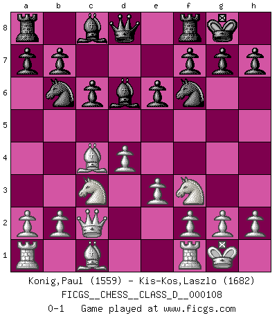 Last move : 0-1 2008 December 10 14:6:25 [Event "FICGS__CHESS__CLASS_D__000108"] [Site "FICGS"] [Date "2008.10.26"] [Round "1"] [White "Konig,Paul"] [Black "Kis-Kos,Laszlo"] [Result "0-1"] [WhiteElo "1559"] [BlackElo "1682"] 1.c4 Nf6 2.Nf3 e6 3.Nc3 d5 4.d4 c6 5.e3 Nbd7 6.Bd3 dxc4 7.Bxc4 Bd6 8.O-O O-O 9.Qc2 Nb6 0-1 This chess game has been lost on time (started : 2008.10.26 12:44:42) English Opening Kingside Castling by player White (move 8) Kingside Castling by player Black (move 8) Player Black won this chess game. Follow this game move after move (download)Chess is the gymnasium of the mind. (Blaise Pascal) Jeder Schachmeister war einmal ein Anfänger. (Irving Chernev) Una de estas pequeñas movidas modestas pudieran ser mas molestas a tu oponente que la amenaza mas grande. (Siegbert Tarrasch) Le système Elo représente seulement une moyenne. Il est simplement un indicateur de votre stabilité. (Anatoli Karpov) The good fighters of old first put themselves beyond the possibility of defeat, and then waited for an opportunity of defeating the enemy. (Sun Tzu)