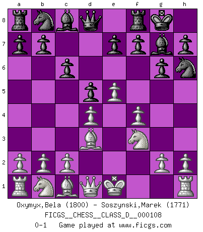 Last move : 0-1 2008 December 6 10:51:44 [Event "FICGS__CHESS__CLASS_D__000108"] [Site "FICGS"] [Date "2008.10.26"] [Round "1"] [White "Oxymyx,Bela"] [Black "Soszynski,Marek"] [Result "0-1"] [WhiteElo "1800"] [BlackElo "1771"] 1.d4 c6 2.e4 d5 3.e5 g6 4.f4 Bg7 5.Nf3 Nh6 6.Bd3 O-O 0-1 This chess game has been lost on time (started : 2008.10.26 12:44:42) Queen's pawn Kingside Castling by player Black (move 6) Player Black won this chess game. Follow this game move after move (download)You may learn much more from a game you lose than from a game you win. You will have to lose hundreds of games before becoming a good player. (Jose Raul Capablanca) Ich verachte die Medien. (Robert James Fischer) Morphy probablemente fue el genio más grande de todos. (Bobby Fischer) Votre prénom est 'Tactique', votre deuxième prénom est 'Tactique' et votre nom est 'Tactique'. (Ken Smith) Art is the triumph over chaos. (John Cheever)