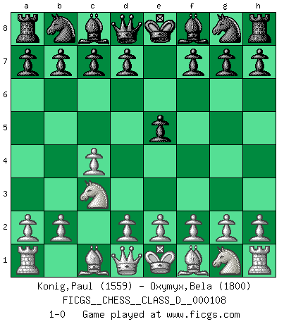 Last move : 1-0 2008 December 16 2:43:32 [Event "FICGS__CHESS__CLASS_D__000108"] [Site "FICGS"] [Date "2008.10.26"] [Round "1"] [White "Konig,Paul"] [Black "Oxymyx,Bela"] [Result "1-0"] [WhiteElo "1559"] [BlackElo "1800"] 1.c4 e5 2.Nc3 1-0 This chess game has been lost on time (started : 2008.10.26 12:44:42) English Opening Player White won this chess game. Follow this game move after move (download)Look at Garry Kasparov. After he loses, invariably he wins the next game. He just kills the next guy. That's something that we have to learn to be able to do. (Maurice Ashley) Deine Wertungszahl - vorausgesetzt einige Jahre schachliche Anstrengung - entspricht etwa dem zehnfachen Deines IQ plus 1000. (Jonathan Levitt) La pasion por jugar al Ajedrez es una de las mas inexplicables en el mundo. (H.G. Wells) Si le désir cupide (et stupide) de gagner est une inépuisable source de souffrance, une combinaison brillante sur l'échiquier est une découverte : le coquelicot qui s'épanouit lorsque apparaît la Voie Lactée. (Arrabal) History is a gallery of pictures in which there are few originals and many copies. (Alexis de Tocqueville)