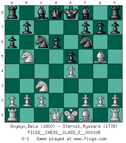 Last move : 0-1 2008 December 6 10:51:44 [Event "FICGS__CHESS__CLASS_D__000108"] [Site "FICGS"] [Date "2008.10.26"] [Round "1"] [White "Oxymyx,Bela"] [Black "Sternik,Ryszard"] [Result "0-1"] [WhiteElo "1800"] [BlackElo "1778"] 1.e4 c5 2.Nf3 Nc6 3.d4 cxd4 4.Nxd4 Nf6 5.Nc3 e5 6.Ndb5 d6 7.Bg5 a6 0-1 This chess game has been lost on time (started : 2008.10.26 12:44:42) Sicilian : Pelikan (Lasker/Sveshnikov) variation Player Black won this chess game. Follow this game move after move (download)Fischer is under obligation to nobody. (Joseph Platz) Glücklicherweise sind Großmeister Ruben Fines reine Schachbücher weniger phallozentrisch [als seine Schachpsychologie] und deswegen auch weniger lächerlich. (Nigel Short) Una mala movida nulifica cuarenta buenas. (Horowitz) Shah mat. Le roi est mort. Cri de fierté d'un joueur venant de terrasser son adversaire, courtoisement, sans effusion de sang. Crush them ! Make them suffer ! (General Grievous in Star Wars ep.3)