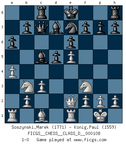 Last move : 1-0 2009 January 19 19:22:1 [Event "FICGS__CHESS__CLASS_D__000108"] [Site "FICGS"] [Date "2008.10.26"] [Round "1"] [White "Soszynski,Marek"] [Black "Konig,Paul"] [Result "1-0"] [WhiteElo "1771"] [BlackElo "1559"] 1.e4 c5 2.d4 cxd4 3.Qxd4 Nc6 4.Qa4 e6 5.Nf3 Bc5 6.Be2 d6 7.O-O Bd7 8.c3 Nd4 9.Qd1 Nxe2+ 10.Qxe2 Qc7 11.a4 a6 12.e5 d5 13.Nbd2 Ne7 14.Nb3 Rc8 15.Re1 1-0 This chess game has been lost on time (started : 2008.10.26 12:44:42) Sicilian : Smith-Morra gambit Kingside Castling by player White (move 7) Player White won this chess game. Follow this game move after move (download)A good sacrifice is one that is not necessarily sound but leaves your opponent dazed and confused. (Rudolph Spielmann) Es gibt Leute, die glauben, alles wäre vernünftig, was man mit einem ernsthaften Gesicht tut. (Georg Christoph Lichtenberg) Para mi, el Ajedrez es la vida y cada partida es como una nueva vida. Todo jugador de Ajedrez suele vivir muchas vidas durante su vida. (Eduard Gufeld) La vie est comme un jeu d'échecs : nous esquissons un plan, mais celui-ci est tributaire de ce que daignent faire l'adversaire aux échecs et le destin dans la vie. (Arthur Schopenhauer) Life doesn't imitate art, it imitates bad television. (Woody Allen)