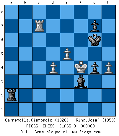 Last move : 0-1 2009 May 31 6:52:50 [Event "FICGS__CHESS__CLASS_B__000060"] [Site "FICGS"] [Date "2008.10.27"] [Round "1"] [White "Carnemolla,Giampaolo"] [Black "Riha,Josef"] [Result "0-1"] [WhiteElo "1826"] [BlackElo "1953"] 1.e4 e5 2.Nf3 Nc6 3.Bc4 Bc5 4.Nc3 Nf6 5.O-O O-O 6.d3 d6 7.Bg5 h6 8.Bxf6 Qxf6 9.Nd5 Qd8 10.h3 Be6 11.c3 Na5 12.b4 Nxc4 13.bxc5 Na5 14.cxd6 Qxd6 15.Qa4 Nc6 16.Qb5 Rab8 17.Rab1 a6 18.Qb3 b5 19.Rfd1 Kh8 20.c4 Nd4 21.Nxd4 exd4 22.Qc2 c5 23.Rdc1 Rfe8 24.f3 f5 25.cxb5 fxe4 26.Qxc5 Qxd5 27.Qxd5 Bxd5 28.fxe4 Be6 29.bxa6 Rxb1 30.Rxb1 Ra8 31.Rb6 Bc8 32.Rd6 Bxa6 33.Rxd4 Bb5 34.Rd5 Be8 35.a4 Bxa4 36.Kf2 Bd1 37.e5 Ra2+ 38.Kg3 Kh7 39.d4 Kg6 40.Rd7 Ba4 41.Ra7 Bb3 42.Rd7 Bc4 43.h4 h5 44.Kf3 Bb5 45.Rc7 Bf1 46.g4 Be2+ 47.Ke4 hxg4 48.Kf4 Bf3 0-1 This chess game has been lost on time (started : 2008.10.27 14:58:46) Giuoco Piano : Four knights variation Kingside Castling by player White (move 5) Kingside Castling by player Black (move 5) 10 pieces endgame at move 47 : White KRPPP , Black KRBPP WHITE : King + 1 Rook 3 Pawns BLACK : King + 1 Rook 1 Bishop 2 Pawns Player Black won this chess game. Follow this game move after move (download)Every Chess master was once a beginner. (Chernev) Sie bekommen vielleicht den Eindruck, dass die Spitzenspieler überhaupt gar nicht so stark sind. Aber das stimmt nicht. Es ist eine Illusion. Mit einem Computer an der Seite ist es sehr leicht, Urteile zu fällen, aber wenn man alleine am Brett sitzt, sieht die Sache ganz anders aus. (Vladimir Kramnik) Debió haber existido una vez en que los hombres eran semidióses, de otra manera no hubiesen podido inventar el Ajedrez. (Gustav Schenk) Mais n'est-ce pas déjà le limiter injurieusement que d'appeler les échecs un jeu? N'est-ce pas aussi une science, un art, ou quelque chose qui, comme le cercueil de Mahomet entre ciel et terre, est suspendu entre l'un et l'autre, et qui réunit un nombre incroyable de contraires ? (Stefan Zweig) They misunderestimated me. (George W. Bush, Bentonville nov. 6, 2000)