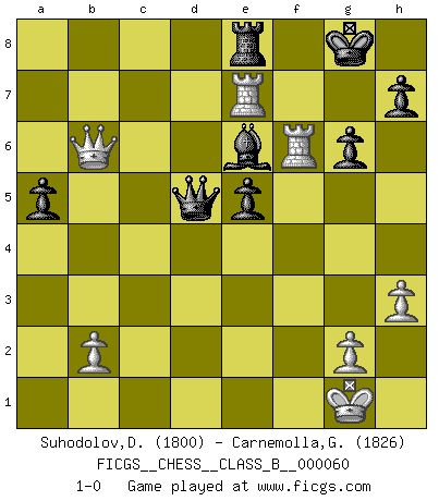 Last move : 1-0 2009 September 6 7:46:54 [Event "FICGS__CHESS__CLASS_B__000060"] [Site "FICGS"] [Date "2008.10.27"] [Round "1"] [White "Suhodolov,Dmitry"] [Black "Carnemolla,Giampaolo"] [Result "1-0"] [WhiteElo "1800"] [BlackElo "1826"] 1.d4 Nf6 2.c4 g6 3.Nc3 Bg7 4.e4 d6 5.Nf3 O-O 6.Be2 Nbd7 7.O-O e5 8.Be3 Ng4 9.Bg5 f6 10.Bd2 Nh6 11.Qc2 a5 12.Rad1 exd4 13.Nxd4 Nc5 14.Rfe1 Bd7 15.Nb3 Ne6 16.Be3 b6 17.Qd2 Nf7 18.f4 Qe7 19.f5 Neg5 20.c5 Nxe4 21.Nxe4 Qxe4 22.Bf3 Qxf5 23.Nd4 Qxc5 24.Bxa8 Rxa8 25.Ne6 Qc4 26.Nxg7 Kxg7 27.Rc1 Qxa2 28.Rxc7 Qa4 29.Bd4 Re8 30.Rf1 Kg8 31.Rxf6 Re4 32.Bc3 Qb5 33.h3 Re7 34.Qd4 Qe5 35.Qxb6 Qd5 36.Qa7 Ne5 37.Bxe5 dxe5 38.Qb8+ Re8 39.Qb6 Be6 40.Re7 1-0 King's Indian : 6.Be2 Kingside Castling by player Black (move 5) Kingside Castling by player White (move 7) Player White won this chess game. Follow this game move after move (download)We cannot resist the fascination of sacrifice, since a passion for sacrifices is part of a Chessplayer's nature. (Rudolf Spielman) Schach ist das schnellste Spiel der Welt, weil man in jeder Sekunde Tausende von Gedanken ordnen muß. (Albert Einstein) a manera como él juega al Ajedrez, demuestra la completa naturaleza de un hombre. (Stanley Ellin) La vie et les Echecs sont tous les deux une lutte constante. (Lasker) I think your argument is specious - I think your tie is ugly. (Gregory House to Dr. Foreman, House M.D.)