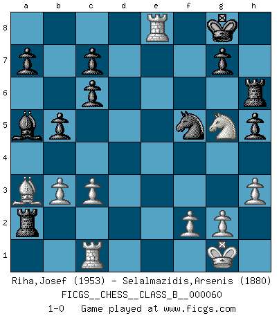 Last move : 1-0 2009 January 4 20:24:12 [Event "FICGS__CHESS__CLASS_B__000060"] [Site "FICGS"] [Date "2008.10.27"] [Round "1"] [White "Riha,Josef"] [Black "Selalmazidis,Arsenis"] [Result "1-0"] [WhiteElo "1953"] [BlackElo "1880"] 1.e4 e5 2.Nf3 Nc6 3.Bb5 Nf6 4.O-O Nxe4 5.d4 Nd6 6.Bxc6 dxc6 7.dxe5 Nf5 8.Qxd8+ Kxd8 9.Nc3 h6 10.h3 Be6 11.b3 Ke8 12.Bb2 Rd8 13.Ne4 Bd5 14.Rfe1 Bb4 15.c3 Ba5 16.Rac1 b5 17.Ba3 h5 18.Nfg5 Rh6 19.e6 Bxe6 20.Nc5 Rd2 21.Ncxe6 fxe6 22.Nxe6 Kf7 23.Ng5+ Kg6 24.Nf3 Rxa2 25.Re6+ Kh7 26.Ng5+ Kg8 27.Re8+ 1-0 Ruy Lopez : Berlin defense, Open variation Kingside Castling by player White (move 4) Player White won this chess game. Follow this game move after move (download)It is no time to be playing Chess when the house is on fire. (Italian Proverb) Es ist besser die Steine des Gegners zu opfern. (Savielly Grigorievitsch Tartakower) Dejen al perfeccionista jugar por correo. (Yasser Seirawan) Donnez-moi un Cavalier en 6e et je gagnerais toutes mes parties. (Steinitz) It is not titles that honor men, but men that honor titles. (Niccolo Machiavelli)