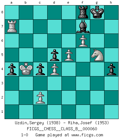 Last move : 1-0 2008 November 29 18:3:7 [Event "FICGS__CHESS__CLASS_B__000060"] [Site "FICGS"] [Date "2008.10.27"] [Round "1"] [White "Uzdin,Sergey"] [Black "Riha,Josef"] [Result "1-0"] [WhiteElo "1938"] [BlackElo "1953"] 1.e4 e6 2.d4 d5 3.Nc3 Bb4 4.e5 c5 5.a3 Bxc3+ 6.bxc3 Ne7 7.Qg4 O-O 8.Bd3 Nbc6 9.Qh5 Ng6 10.Nf3 Qc7 11.Be3 c4 12.Bxg6 fxg6 13.Qg4 Qf7 14.Ng5 Qe8 15.h4 Bd7 16.Nh3 Ne7 17.Nf4 Nf5 18.h5 Nh6 19.Qe2 g5 20.Nh3 g4 21.Ng1 Kh8 22.Bxh6 gxh6 23.Qxg4 Ba4 24.Qe2 Rf5 25.Nh3 Qb5 26.O-O-O Raf8 27.f4 Qa5 28.Kd2 Rg8 29.g4 Rxh5 30.Qf3 Rh4 31.Nf2 Qd8 32.Rxh4 Qxh4 33.Rh1 Qe7 34.Rxh6 Be8 35.Rf6 a5 36.f5 exf5 37.gxf5 Qxa3 38.Rd6 b5 39.f6 b4 40.Rd8 Qxc3+ 41.Qxc3 bxc3+ 42.Kxc3 Bf7 43.Rd7 Rf8 44.Re7 a4 45.Nh3 Kg8 46.Ra7 h5 47.Ng5 h4 48.Kb4 1-0 French : Winawer, Advance, poisoned pawn variation Kingside Castling by player Black (move 7) Queenside Castling by player White (move 26) Player White won this chess game. Follow this game move after move (download)I play correspondence chess because it is both art and science while chess is art only. (A player at FICGS) Ich spiele 70 Eröffnungssysteme. (Viktor Kortschnoi) Mis oponentes también hacen buenas movidas. A veces yo no tomo esas cosas en consideración. (Bobby Fischer) Dans le domaine de la peinture, de la gravure et de la sculpture, dès la première décennie de notre siècle, les artistes abandonnent la représentation de la partie d'échecs pour se concentrer sur les pièces, sur les échiquiers et sur toutes les variations auxquelles les unes et les autres peuvent donner lieu. On passe en quelque sorte d'un thème social à un thème musical (au sens de la musica médiévale, c'est-à-dire d'une notion qui inclue le rythme, l'harmonie, la construction et la déconstruction, etc.). Graphiquement et picturalement, l'échiquier apparaît comme une structure ouverte, dynamique, d'une richesse infinie, autorisant toutes les combinatoires et débouchant sur des mouvements et des rythmes de nature exponentielle. (Michel Pastoureau) When you stop learning you start dying. (M. Scott Adams)