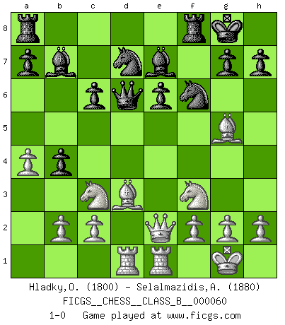 Last move : 1-0 2009 January 15 18:32:52 [Event "FICGS__CHESS__CLASS_B__000060"] [Site "FICGS"] [Date "2008.10.27"] [Round "1"] [White "Hladky,Ostap"] [Black "Selalmazidis,Arsenis"] [Result "1-0"] [WhiteElo "1800"] [BlackElo "1880"] 1.e4 d5 2.exd5 Qxd5 3.Nf3 Nf6 4.Nc3 Qa5 5.Bc4 e6 6.d4 c6 7.O-O Be7 8.Bf4 O-O 9.Re1 Rd8 10.a3 b5 11.Bd3 Bb7 12.Qd2 Qb6 13.a4 Bb4 14.Bg5 Nbd7 15.Ne5 Be7 16.Qe2 b4 17.Nxf7 Rf8 18.Ne5 Qxd4 19.Nf3 Qd6 20.Rad1 1-0 Scandinavian (centre counter) defense Kingside Castling by player White (move 7) Kingside Castling by player Black (move 8) Player White won this chess game. Follow this game move after move (download)The chessboard is the world, the pieces are the phenomena of the Universe, the rules of the game are what we call the laws of Nature and the player on the other side is hidden from us. (Thomas Huxley) Fischer ist das größte Genie, das je vom Schachhimmel heruntergestiegen ist. (Mikhail Nekhemyevich Tal) El pensamiento metódico es mas útil en el Ajedrez que la inspiración. (C. J. S. Purdy) Je crois qu'il existe des manières très spécifiques de jouer efficacement contre une machine. Evidemment, nous n'avons aucune chance en technique pure, parce que l'ordinateur calcule de manière parfaite. Mais lorsque nous faisons appel à notre cerveau, en utilisant l'intuition et la compréhension, alors nous restons beaucoup plus forts. (Anatoli Karpov) All the biggest technological inventions created by man - the airplane, the automobile, the computer - says little about his intelligence, but speaks volumes about his laziness. (Mark Kennedy)