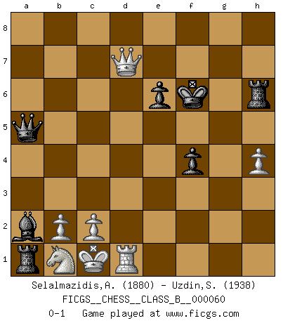Last move : 0-1 2009 March 18 9:54:29 [Event "FICGS__CHESS__CLASS_B__000060"] [Site "FICGS"] [Date "2008.10.27"] [Round "1"] [White "Selalmazidis,Arsenis"] [Black "Uzdin,Sergey"] [Result "0-1"] [WhiteElo "1880"] [BlackElo "1938"] 1.e4 c5 2.Nf3 d6 3.d4 cxd4 4.Nxd4 Nf6 5.Nc3 a6 6.Bg5 e6 7.Qd2 Be7 8.O-O-O b5 9.a3 Bb7 10.f3 Nbd7 11.Be2 h6 12.Be3 Nb6 13.g4 Nfd7 14.h4 Ne5 15.f4 Nbc4 16.Bxc4 Nxc4 17.Qe2 Rc8 18.Rd3 b4 19.axb4 Qb6 20.Nb3 Qxb4 21.Bd4 a5 22.Na2 Qb5 23.Nc3 Qc6 24.Bxg7 Rg8 25.Bxh6 a4 26.Nd4 Qc5 27.Nxa4 Ra8 28.Nc3 Ra1+ 29.Nb1 Bf6 30.e5 dxe5 31.Nxe6 fxe6 32.g5 Rg6 33.Re1 Qa5 34.Rc3 Bd5 35.Rxc4 Bxc4 36.Qe4 Rxh6 37.gxf6 exf4 38.Rd1 Ba2 39.Qc6+ Kf7 40.Qd7+ Kxf6 0-1 Sicilian : Najdorf, 6...e6 Queenside Castling by player White (move 8) Player Black won this chess game. Follow this game move after move (download)You sit at the board and suddenly your heart leaps. Your hand trembles to pick up the piece and move it. But what Chess teaches you is that you must sit there calmly and think about whether it's really a good idea and whether there are other better ideas. (Stanley Kubrick) Jede Eröffnung ist gut genug um gespielt zu werden, wenn nur ihr Ruf schlecht genug ist. (Savielly Grigorievitsch Tartakower) El Ajedrez es sobre todo, ¡una pelea!. (Emanuel Lasker) Ce n'est pas pour s'amuser qu'il joue aux échecs : il célèbre un culte. (Vladimir Nabokov) Shallow men believe in luck. Strong men belive in cause and effect. (Ralph Waldo Emerson)