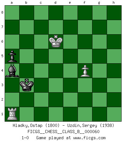 Last move : 1-0 2009 February 7 22:4:17 [Event "FICGS__CHESS__CLASS_B__000060"] [Site "FICGS"] [Date "2008.10.27"] [Round "1"] [White "Hladky,Ostap"] [Black "Uzdin,Sergey"] [Result "1-0"] [WhiteElo "1800"] [BlackElo "1938"] 1.e4 c5 2.Nf3 d6 3.d4 cxd4 4.Nxd4 Nf6 5.Nc3 a6 6.Be3 e6 7.f3 b5 8.g4 h6 9.a3 Bb7 10.Qd2 Nbd7 11.O-O-O Rc8 12.h4 d5 13.Rg1 dxe4 14.g5 hxg5 15.hxg5 Nd5 16.Nxe4 b4 17.g6 bxa3 18.gxf7+ Kxf7 19.Nxe6 Kxe6 20.Kb1 Ke7 21.c4 axb2 22.Bd4 Rh5 23.Rg5 Rh1 24.Rf5 Rxf1 25.Rxf1 Rxc4 26.Qg5+ N7f6 27.Nxf6 Nc3+ 28.Kxb2 Qxd4 29.Nd5+ Kd7 30.Rf7+ Kc6 31.Rc7+ Kd6 32.Qg6+ Kxd5 33.Qf7+ Kd6 34.Rd7+ Kc6 35.Rxd4 Na4+ 36.Kb1 Rxd4 37.Qxf8 Kb5 38.Rg1 Nc5 39.Rxg7 Bc6 40.Rg5 Rb4+ 41.Kc2 Rc4+ 42.Kd2 Kb4 43.Rg4 a5 44.Qd6 Bd7 45.Rg1 Ka4 46.Ke3 Rc3+ 47.Kd4 Rd3+ 48.Kxc5 Rxd6 49.Ra1+ Kb3 50.Kxd6 Ba4 51.f4 1-0 Sicilian : Najdorf, Byrne (English) attack Queenside Castling by player White (move 11) 10 pieces endgame at move 37 : White KQRP , Black KRBNPP WHITE : King + 1 Queen 1 Rook 1 Pawn BLACK : King + 1 Rook 1 Bishop 1 Knight 2 Pawns 9 pieces endgame at move 39 : White KQRP , Black KRBNP WHITE : King + 1 Queen 1 Rook 1 Pawn BLACK : King + 1 Rook 1 Bishop 1 Knight 1 Pawn 8 pieces endgame at move 48 : White KQRP , Black KRBP WHITE : King + 1 Queen 1 Rook 1 Pawn BLACK : King + 1 Rook 1 Bishop 1 Pawn 7 pieces endgame at move 48 : White KRP , Black KRBP WHITE : King + 1 Rook 1 Pawn BLACK : King + 1 Rook 1 Bishop 1 Pawn 6 pieces endgame at move 50 : White KRP , Black KBP WHITE : King + 1 Rook 1 Pawn BLACK : King + 1 Bishop 1 Pawn Player White won this chess game. Follow this game move after move (download)A passed Pawn increases in strength as the number of pieces on the board diminishes. (Capablanca) Dass jemand wie Surab Asmaiparaschwili, der selbst Elopunkte gekauft hat , Vize-Präsident der Fide werden konnte, sagt schon einges über den Zustand dieser Organisation aus. (Joel Lautier) Todos los Maestros de Ajedrez fueron un día unos principiantes. (Chernev) L'action d'une oeuvre littéraire se déroule sur un champ de bataille. Les masques et les types du drame moderne correspondent aux pièces du jeu d'échecs. L'intrigue correspond aux coups et aux gambits, c'est à dire aux techniques du jeu telles qu'utilisées et interprétées par les joueurs. Les tactiques et les péripéties [mouvements] correspondent aux coups exécutés par l'adversaire. (Viktor Shklovsky) It is a good thing for an uneducated man to read books of quotations. (Winston Churchill)