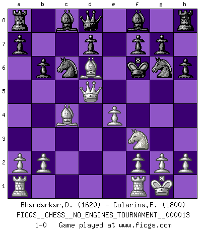 Last move : 1-0 2008 November 13 14:57:50 [Event "FICGS__CHESS__NO_ENGINES_TOURNAMENT__000013"] [Site "FICGS"] [Date "2008.10.27"] [Round "1"] [White "Bhandarkar,Dinesh"] [Black "Colarina,Floram"] [Result "1-0"] [WhiteElo "1620"] [BlackElo "1800"] 1.e4 c5 2.d4 cxd4 3.c3 dxc3 4.Nxc3 e6 5.Nf3 Nc6 6.Bc4 h6 7.O-O b6 8.Bf4 Nge7 9.Nb5 Ng6 10.Nc7+ Ke7 11.Bd6+ Kf6 12.Nd5+ exd5 13.Qxd5 1-0 Sicilian : Smith-Morra gambit Kingside Castling by player White (move 7) Player White won this chess game. Follow this game move after move (download)With or without the title, Bobby Fischer was unquestionably the greatest player of his time. (Burt Hochberg) Im Schach gewinnt jeder. Hat man Freunde am Spiel - und das ist die Hauptsache - ist auch der Verlust einer Partie kein Unglück. (David Bronstein) Mis oponentes también hacen buenas movidas. A veces yo no tomo esas cosas en consideración. (Bobby Fischer) Karpov est une pièce de musée. (Garry Kasparov) When the going gets tactical, the computers get going. (Hyatt)