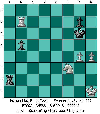 Last move : 1-0 2006 November 18 18:4:59 [Event "FICGS__CHESS__RAPID_B__000012"] [Site "FICGS"] [Date "2006.08.16"] [Round "1"] [White "Haluschka,Rainer"] [Black "Franchino,Sebastian"] [Result "1-0"] [WhiteElo "1700"] [BlackElo "1400"] 1.Nf3 d5 2.d4 e6 3.e3 a6 4.Bd3 Bd6 5.O-O c5 6.c4 Nf6 7.cxd5 exd5 8.dxc5 Bxc5 9.Nc3 Nc6 10.e4 d4 11.e5 Nxe5 12.Re1 dxc3 13.Rxe5+ Be7 14.Qe2 Kf8 15.Bc2 Bd7 16.Bb3 Bb5 17.Rxb5 axb5 18.Ne5 Bc5 19.Nxf7 Qe8 20.Qf1 Rg8 21.bxc3 Ne4 22.Be3 Bxe3 23.fxe3 Nf6 24.Re1 Qc6 25.Ng5 Qxc3 26.Nxh7+ Ke7 27.Rc1 Qe5 28.Bxg8 Nxg8 29.Qf3 Kd6 30.Kh1 Ne7 31.Qxb7 Rc8 32.Rd1+ Ke6 33.h4 Kf7 34.Ng5+ Kg6 35.g4 Rh8 36.Nf3 Qxe3 37.Re1 Rb8 38.Qa6+ Rb6 39.Rxe3 Rxa6 40.Rxe7 Rxa2 41.Rb7 1-0 Reti Opening Kingside Castling by player White (move 5) 10 pieces endgame at move 40 : White KRNPPP , Black KRPP WHITE : King + 1 Rook 1 Knight 3 Pawns BLACK : King + 1 Rook 2 Pawns 9 pieces endgame at move 40 : White KRNPP , Black KRPP WHITE : King + 1 Rook 1 Knight 2 Pawns BLACK : King + 1 Rook 2 Pawns Player White won this chess game. Follow this game move after move (download)There are tough players and nice guys, and I'm a tough player. (Bobby Fischer) Es genügt nicht ein guter Spieler zu sein, man muß auch gut spielen. (Siegbert Tarrasch) El Ajedrez es un invernadero donde los frutos del carácter pueden madurar mas completamente que en la vida. (Edward Morgan Foster) J'ai toujours senti une vague pitié pour l'homme qui ne connaît rien aux échecs, tout comme j'en aurais pour un homme ignorant de l'amour. Les Echecs, comme la musique ou comme l'amour, ont le pouvoir de rendre heureux. (Siegbert Tarrasch) Life is verb, not a noun. (Charlotte Perkins Gilman)