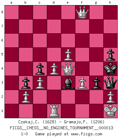 Last move : 1-0 2009 March 18 19:15:46 [Event "FICGS__CHESS__NO_ENGINES_TOURNAMENT__000013"] [Site "FICGS"] [Date "2008.10.27"] [Round "1"] [White "Czekaj,Christophe"] [Black "Gramajo,Francisco"] [Result "1-0"] [WhiteElo "1628"] [BlackElo "1206"] 1.d4 d5 2.Nc3 Nf6 3.Bg5 Nbd7 4.e3 g6 5.f4 Bg7 6.Nf3 O-O 7.Bd3 c6 8.O-O a6 9.Qe1 b5 10.a4 b4 11.Ne2 a5 12.Ne5 c5 13.c3 c4 14.Bc2 b3 15.Bd1 Ne4 16.Nc6 Qc7 17.Nxe7+ Kh8 18.Nxd5 Qd6 19.Ne7 Nxg5 20.Nxc8 Raxc8 21.fxg5 f6 22.gxf6 Nxf6 23.Ng3 Nd5 24.e4 Rxf1+ 25.Nxf1 Nf4 26.e5 Qe6 27.Bf3 Nd3 28.Qe2 Rd8 29.Rd1 h5 30.Ng3 Nf4 31.Qe4 Bh6 32.Ne2 Rf8 33.Nxf4 Rxf4 34.Qa8+ Rf8 35.Qxa5 Rxf3 36.gxf3 Be3+ 37.Kh1 Qh3 38.Qd8+ Kh7 39.Qe7+ Kh6 40.Qf8+ Kg5 41.a5 Kh4 42.a6 g5 43.a7 g4 44.a8Q g3 45.Qe4+ 1-0 Richter-Veresov attack Kingside Castling by player Black (move 6) Kingside Castling by player White (move 8) Promotion Queen by player White (move 44) Player White won this chess game. Follow this game move after move (download)Why must I lose to this idiot ? (Aron Nimzovich) Mutter, ich bin eben Ex-Weltmeister geworden. --beim nach Hause Kommen nach dem Verlust des WM-Titels an Mihail Botvinnik -- (Mikhail Nekhemyevich Tal) La vida es como un juego de Ajedrez, cambiando con cada movimiento. (Proverbio Chino) Un footballeur joue avec ses pieds, parfois avec sa tête. Un joueur d'échecs ne joue qu'avec sa tête. Et quand il ne joue plus, il meurt. (Jacob Murray) Over-the-board chess is the favorite of mortals, correspondence chess is the favorite of the gods. (Eduard Dyckhoff)