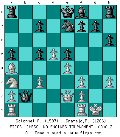 Last move : 1-0 2008 November 4 20:34:47 [Event "FICGS__CHESS__NO_ENGINES_TOURNAMENT__000013"] [Site "FICGS"] [Date "2008.10.27"] [Round "1"] [White "Satonnet,Patrick"] [Black "Gramajo,Francisco"] [Result "1-0"] [WhiteElo "1587"] [BlackElo "1206"] 1.e4 e5 2.Nf3 Nc6 3.Bb5 Nge7 4.c3 d6 5.O-O Bg4 6.d4 a6 7.Ba4 b5 8.Bc2 a5 9.d5 Nb8 10.Qd3 Na6 11.Qxb5+ Bd7 12.Qd3 Nc5 13.Qe2 Bg4 14.Be3 Qb8 15.Na3 h6 16.h3 Bxf3 17.gxf3 Qxb2 18.Bxc5 dxc5 19.Ba4+ 1-0 Ruy Lopez : Cozio defense Kingside Castling by player White (move 5) Player White won this chess game. Follow this game move after move (download)The hallmark of the artist is simplicity. (Larry Evans) Kostenjuk hat keinen Sexappeal. (Loek van Wely) El Ajedrez es realmente noventa y nueve por ciento calculación. (Soltis) Les échecs sont plus proches de l'art de l'assassinat que de l'art de la guerre. (Arturo Perez-Reverte) Wawaweewa ! (Borat: Cultural learnings of America for make benefit glorious nation of Kazakhstan)