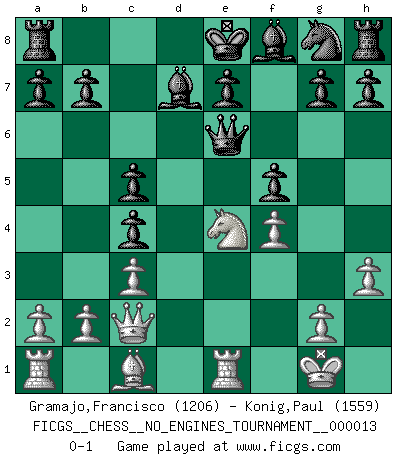 Last move : 0-1 2008 December 4 0:40:49 [Event "FICGS__CHESS__NO_ENGINES_TOURNAMENT__000013"] [Site "FICGS"] [Date "2008.10.27"] [Round "1"] [White "Gramajo,Francisco"] [Black "Konig,Paul"] [Result "0-1"] [WhiteElo "1206"] [BlackElo "1559"] 1.e4 c5 2.Bc4 Nc6 3.c3 Nf6 4.Nf3 d5 5.e5 dxc4 6.d4 Ng8 7.d5 Nb8 8.Nbd2 Qxd5 9.O-O Bg4 10.h3 Bf5 11.Qa4+ Bd7 12.Qc2 Nc6 13.Ne4 Nxe5 14.Nxe5 Qxe5 15.Re1 f5 16.f4 Qe6 0-1 Sicilian defense Kingside Castling by player White (move 9) Player Black won this chess game. Follow this game move after move (download)Fischer, who may or may not be mad as a hatter, has every right to be horrified. (Jeremy Silman) Darum geht es im Schach. Einen Tag gibst du deinem Gegner eine Lektion, am nächsten Tag gibt er dir eine. (Robert James Fischer) El Ajedrez es una guerra en un tablero. El objetivo es aplastar la mente del oponente. (Bobby Fischer) Nous sommes les pions de la mystérieuse partie d'Echecs jouée par Dieu. Il nous déplace, nous arrête, nous pousse encore, puis nous lance un à un dans la boîte du Néant. Epitaphe sur la tombe de David Janowsky (1868-1927). Computers are like Old Testament gods; lots of rules and no mercy. (Joseph Campbell)