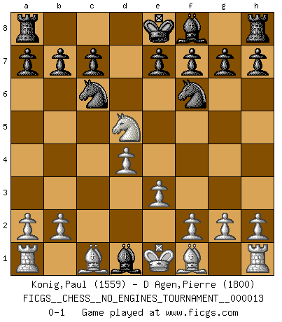 Last move : 0-1 2008 November 28 1:44:38 [Event "FICGS__CHESS__NO_ENGINES_TOURNAMENT__000013"] [Site "FICGS"] [Date "2008.10.27"] [Round "1"] [White "Konig,Paul"] [Black "D Agen,Pierre"] [Result "0-1"] [WhiteElo "1559"] [BlackElo "1800"] 1.d4 d5 2.c4 Nc6 3.e3 Nf6 4.Nf3 Bg4 5.cxd5 Qxd5 6.Nc3 Bxf3 7.Nxd5 Bxd1 0-1 QGD : Chigorin defense Player Black won this chess game. Follow this game move after move (download)When you play Bobby, it is not a question if you win or lose. It is a question if you survive. (Boris Spassky) Wer wird heute Abend ihr Gegner sein? -- Heute Abend spiele ich gegen die schwarzen Steine. (Akiba Rubinstein) Solo puedes ser bueno en el Ajedrez si amas al juego. (Bobby Fischer) Des combinaisons [dans le jeu d'échecs] pareilles à des mélodies. Je crois entendre pour ainsi dire la musique des coups... (Vladimir Nabokov) Once you start thinking you have nothing left to learn, you have everything to learn. (Steve Badget)