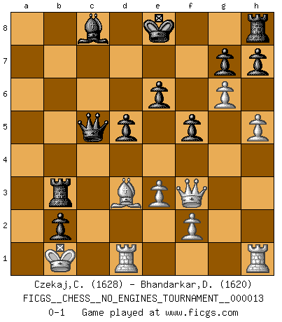 Last move : 0-1 2009 January 21 12:25:30 [Event "FICGS__CHESS__NO_ENGINES_TOURNAMENT__000013"] [Site "FICGS"] [Date "2008.10.27"] [Round "1"] [White "Czekaj,Christophe"] [Black "Bhandarkar,Dinesh"] [Result "0-1"] [WhiteElo "1628"] [BlackElo "1620"] 1.d4 d5 2.Nc3 Nf6 3.Bg5 Nbd7 4.e3 e6 5.Qf3 Be7 6.O-O-O c5 7.g4 Qa5 8.h4 c4 9.Nh3 b5 10.Bxf6 Bxf6 11.g5 Be7 12.Kb1 b4 13.Ne2 c3 14.Nc1 Rb8 15.Nb3 Qb6 16.Nf4 a5 17.Nd3 a4 18.Nbc5 Nxc5 19.Nxc5 Bxc5 20.dxc5 Qxc5 21.h5 cxb2 22.Bd3 b3 23.cxb3 axb3 24.axb3 Rxb3 25.g6 f5 0-1 Richter-Veresov attack Queenside Castling by player White (move 6) Player Black won this chess game. Follow this game move after move (download)By playing at Chess then, we may learn: First: Foresight... Second: Circumspection... Third: Caution... And lastly, we learn by Chess the habit of not being discouraged by present bad appearances in the state of our affairs, the habit of hoping for a favorable chance, and that of persevering in the secrets of resources. (Benjamin Franklin) Ein Großmeister muß tausende Partien in seinem Kopf speichern, denn diese sind für Ihn, was die Worte der Muttersprache für gewöhnliche Leute sind, oder Noten für Musiker... (Garry Kasparov) El Ajedrez es un expediente tonto que hace creer a la gente inactiva que hacen una cosa muy astuta cuando solamente estan perdiendo su tiempo. (George Bernard Shaw) Shah mat. Le roi est mort. Cri de fierté d'un joueur venant de terrasser son adversaire, courtoisement, sans effusion de sang. In my experience, there's no such thing as luck. (Obi-Wan Kenobi in Star Wars ep.4)