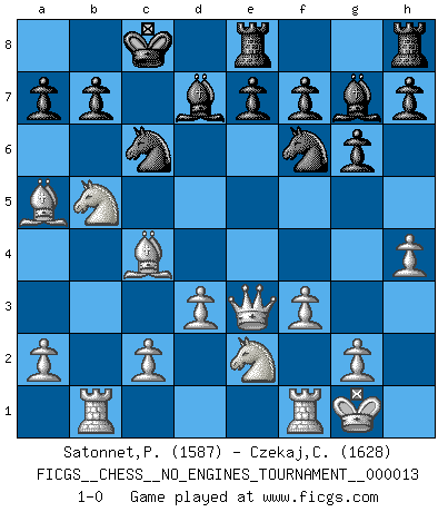 Last move : 1-0 2008 December 30 12:32:22 [Event "FICGS__CHESS__NO_ENGINES_TOURNAMENT__000013"] [Site "FICGS"] [Date "2008.10.27"] [Round "1"] [White "Satonnet,Patrick"] [Black "Czekaj,Christophe"] [Result "1-0"] [WhiteElo "1587"] [BlackElo "1628"] 1.e4 g6 2.h4 d5 3.exd5 Qxd5 4.Nc3 Qd6 5.Bc4 Bg7 6.Qf3 Nf6 7.d3 Nc6 8.Bf4 Qb4 9.Nge2 Bg4 10.Qe3 O-O-O 11.f3 Qxb2 12.O-O Bd7 13.Rab1 Qa3 14.Nb5 Qa5 15.Bxc7 Rde8 16.Bxa5 1-0 Robatsch (Modern) defense Queenside Castling by player Black (move 10) Kingside Castling by player White (move 12) Player White won this chess game. Follow this game move after move (download)I'd rather have a Pawn than a finger. (Reuben Fine) Es war undenkbar für die Behörden, dass ein sowjetischer Großmeister auf diese Art und Weise [Fischer-Taimanov 6:0] verliert, ohne dass es eine politischer Erklärung dafür gäbe. (Mark Taimanov) La batalla por la última verdad nunca sera ganada. Y es por eso que el Ajedrez es tan fascinante. (Hans Kmoch) La vie est comme un jeu d'échecs : nous esquissons un plan, mais celui-ci est tributaire de ce que daignent faire l'adversaire aux échecs et le destin dans la vie. (Arthur Schopenhauer) Two beer, or not two beer. (Unknown)