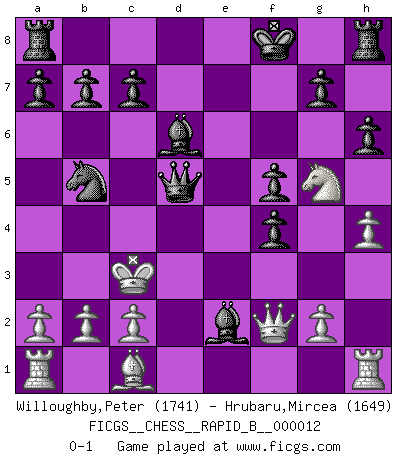 Last move : 0-1 2006 August 27 18:42:46 [Event "FICGS__CHESS__RAPID_B__000012"] [Site "FICGS"] [Date "2006.08.16"] [Round "1"] [White "Willoughby,Peter"] [Black "Hrubaru,Mircea"] [Result "0-1"] [WhiteElo "1741"] [BlackElo "1649"] 1.e4 e5 2.f4 exf4 3.Bc4 f5 4.e5 Nc6 5.d4 d5 6.exd6 Qh4+ 7.Kf1 Bxd6 8.Nf3 Qh6 9.Qe2+ Nge7 10.h4 Bd7 11.Ng5 Nxd4 12.Bf7+ Kf8 13.Qf2 Qf6 14.Nc3 h6 15.Nd5 Bb5+ 16.Ke1 Qe5+ 17.Kd1 Be2+ 18.Kd2 Nxd5 19.Bxd5 Qxd5 20.Kc3 Nb5+ 0-1 KGA : Bishop's gambit, Lopez-Gianutio counter-gambit Player Black won this chess game. Follow this game move after move (download)The Pin is mightier than the sword. (Fred Reinfeld) Wer nie einen Fehler gemacht hat, hat nie etwas Neues ausprobiert. (Albert Einstein) En partidas rápidas, el Caballo es mas poderoso que el Alfil. (Vlastimil Hort) Pour moi, les échecs ne sont pas un jeu mais un art. (Alexandre Alekhine) Wisdom begins at the end. (Daniel Webster)