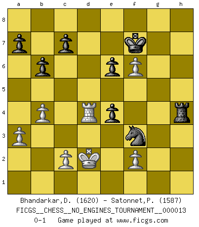 Last move : 0-1 2008 November 16 3:54:17 [Event "FICGS__CHESS__NO_ENGINES_TOURNAMENT__000013"] [Site "FICGS"] [Date "2008.10.27"] [Round "1"] [White "Bhandarkar,Dinesh"] [Black "Satonnet,Patrick"] [Result "0-1"] [WhiteElo "1620"] [BlackElo "1587"] 1.e4 e6 2.d4 b6 3.Bd3 Bb7 4.Nc3 f5 5.exf5 Bxg2 6.Qh5+ g6 7.fxg6 Bg7 8.gxh7 Kf8 9.hxg8Q+ Kxg8 10.Qg4 Bxh1 11.Bg5 Qe8 12.O-O-O Qh5 13.Qf4 Nc6 14.h4 Nb4 15.Be4 Bxe4 16.Nxe4 Qg6 17.Nf3 Rf8 18.Qe3 d5 19.a3 Qxe4 20.Qxe4 dxe4 21.Ne5 Bxe5 22.dxe5 Nc6 23.Bf6 Rxf6 24.exf6 Rh7 25.b4 Ne5 26.Rd8+ Kf7 27.Rd4 Rxh4 28.Kd2 Nf3+ 0-1 French defense Promotion Queen by player White (move 9) Queenside Castling by player White (move 12) Player Black won this chess game. Follow this game move after move (download)Everything is in a state of flux, and this includes the world of Chess. (Mikhail Botvinnik) Die starken Figuren des Gegners muss man abtauschen. (José Raúl Capablanca) El Ajedrez demanda una total concentración. (Bobby Fischer) Les pièces de l'échiquier étaient impitoyables. Elles le retenaient, elles l'absorbaient. Il y avait de l'horreur en cela, mais aussi une harmonie unique. Car, qu'y a-t-il dans le monde, à part les échecs ? (V. Nabokov) Strategy without tactics is the slowest route to victory. Tactics without strategy is the noise before defeat. (Sun Tzu)