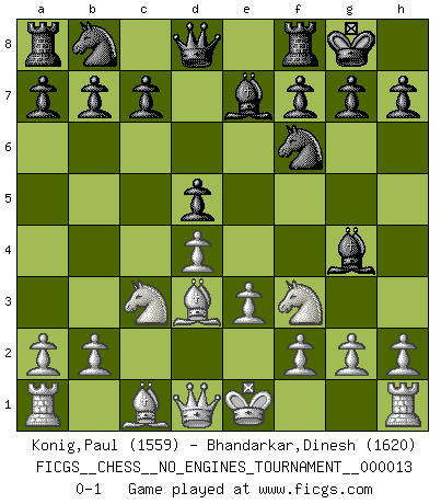 Last move : 0-1 2008 November 28 1:44:7 [Event "FICGS__CHESS__NO_ENGINES_TOURNAMENT__000013"] [Site "FICGS"] [Date "2008.10.27"] [Round "1"] [White "Konig,Paul"] [Black "Bhandarkar,Dinesh"] [Result "0-1"] [WhiteElo "1559"] [BlackElo "1620"] 1.d4 d5 2.c4 e6 3.Nc3 Nf6 4.e3 Be7 5.Nf3 O-O 6.cxd5 exd5 7.Bd3 Bg4 0-1 QGD : 3...Nf6 Kingside Castling by player Black (move 5) Player Black won this chess game. Follow this game move after move (download)The tactician knows what to do when there is something to do; whereas the strategian knows what to do when there is nothing to do. (Gerald Abrahams) Wenn ich gewinne bin ich ein Genie. Wenn nicht, dann bin ich keines. (Robert James Fischer) El Ajedrez es tan interesante por sí solo, que no es necesario un interés monetario para persuadir a una persona a que lo practique; por lo tanto, nunca se juega por dinero. (Benjamin Franklin) Votre seul travail dans les ouvertures est d'obtenir un milieu de partie jouable. (Lajos Portish) Creativity is inventing, experimenting, growing, taking risks, breaking rules, making mistakes, and having fun. (Mary Lou Cook)