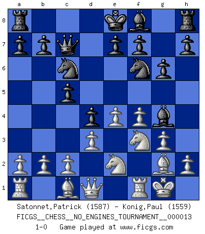 Last move : 1-0 2008 November 28 1:43:11 [Event "FICGS__CHESS__NO_ENGINES_TOURNAMENT__000013"] [Site "FICGS"] [Date "2008.10.27"] [Round "1"] [White "Satonnet,Patrick"] [Black "Konig,Paul"] [Result "1-0"] [WhiteElo "1587"] [BlackElo "1559"] 1.e4 c5 2.f4 d5 3.Nc3 d4 4.Nce2 Nf6 5.d3 Bg4 6.g3 Nc6 7.Bg2 Qc7 8.Nf3 g6 9.O-O 1-0 Sicilian : Grand Prix attack Kingside Castling by player White (move 9) Player White won this chess game. Follow this game move after move (download)Not only will I predict his triumph over Botvinnik, but I'll go further and say that he'll probably be the greatest Chess player that ever lived. (John Collins) Kann Schach nicht schließlich das Nationalspiel der Deutschen werden? Und welche weiteren Ausblicke bieten sich dann dar! Welche Hebung des allgemeinen Kultur-Niveaus, ja der Moral, wenn das Schachbrett den Kartentisch verdrängen würde! Wahrlich, ein Ziel, des Schweißes der Edlen wert! (Siegbert Tarrasch) Antes de los Finales, los dioses han colocado el Juego Medio. (Siegbert Tarrasch) Vous m'avez demandé de vous exposer quel est le fondement de la prière. Je ne fais que préparer les pièces du jeu sur la table... Nous sera-t-il permis d'en adopter les règles et si nous les appliquons scrupuleusement nous ne tarderons pas à faire mat le Roi divin ! Il ne pourra échapper à nos mains. (Sainte Thérèse d'Avila, Chemin de perfection) SEO proverb : Make your website optimized for human beings, not for search engines.