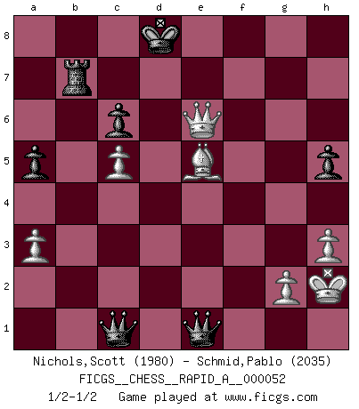 Last move : 1/2-1/2 2009 January 26 22:32:5 [Event "FICGS__CHESS__RAPID_A__000052"] [Site "FICGS"] [Date "2008.10.28"] [Round "1"] [White "Nichols,Scott"] [Black "Schmid,Pablo"] [Result "1/2-1/2"] [WhiteElo "1980"] [BlackElo "2035"] 1.e4 e5 2.Nf3 Nc6 3.Bc4 Nf6 4.d4 exd4 5.e5 d5 6.Bb5 Ne4 7.Nxd4 Bc5 8.Be3 Bd7 9.Bxc6 bxc6 10.Nd2 Qh4 11.O-O O-O 12.c4 Qe7 13.Nxe4 dxe4 14.e6 fxe6 15.Nc2 Bd6 16.c5 Be5 17.Qg4 Bxb2 18.Rad1 a5 19.Qxe4 e5 20.Ne1 Qf7 21.Qa4 Rab8 22.Nd3 Bf5 23.Qxc6 Bc3 24.Qa4 Kh8 25.Qa3 e4 26.Qxc3 exd3 27.Bd4 Rb4 28.Be5 Ra8 29.Rc1 Kg8 30.h3 c6 31.Rfd1 Re8 32.Rd2 h5 33.f4 Rd8 34.Bd6 Qe6 35.a3 Rb5 36.Kf2 Re8 37.Be5 g5 38.Kg1 Qb3 39.Qa1 gxf4 40.Bxf4 Qd5 41.Rf2 Re2 42.Qf6 Rb7 43.Rxe2 dxe2 44.Be5 Qd1+ 45.Kh2 Qxc1 46.Qh8+ Kf7 47.Qf6+ Ke8 48.Qxf5 e1Q 49.Qe6+ Kd8 1/2-1/2 Two knights defense Kingside Castling by player White (move 11) Kingside Castling by player Black (move 11) Promotion Queen by player Black (move 48) This chess game ended in a draw. Follow this game move after move (download)In Fischer's hands, a slight theoretical advantage is as good a being a Queen ahead. (Isaac Kashdan) Sehr viele beherrschen heutzutage das große Einmalseins des Schachspiels und kennen sogar dessen Logarithmentafeln auswendig - deshalb sollte man hin und wieder zu beweisen trachten, dass zwei mal zwei auch fünf sein kann. (Mikhail Nekhemyevich Tal) El Ajedrez es una manera fabulosa para que los niños aprendan a autovalorarse y a autoestimarse. (Saudin Robovic) Des points faibles ou des trous dans la position de l'adversaire doivent être occupés par des pièces et non pas par des pions. (Siegbert Tarrasch) Memory... is the diary that we all carry with us. (Oscar Wilde, The Importance of Being Earnest)