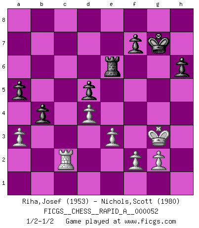 Last move : 1/2-1/2 2008 November 10 21:31:14 [Event "FICGS__CHESS__RAPID_A__000052"] [Site "FICGS"] [Date "2008.10.28"] [Round "1"] [White "Riha,Josef"] [Black "Nichols,Scott"] [Result "1/2-1/2"] [WhiteElo "1953"] [BlackElo "1980"] 1.d4 Nf6 2.c4 e6 3.Nf3 d5 4.Nc3 Bb4 5.Bg5 Nbd7 6.cxd5 exd5 7.e3 c5 8.Bd3 Qa5 9.Qc2 c4 10.Bf5 O-O 11.O-O Re8 12.Nd2 h6 13.Bh4 Nh5 14.h3 g5 15.Bg3 Nf8 16.Ndb1 Be7 17.a3 Rd8 18.Nd2 Qb6 19.Rad1 Bxf5 20.Qxf5 Nf6 21.Qc2 Ng6 22.Nf3 Nh5 23.Bh2 Rd7 24.Rb1 Rad8 25.b3 Qc6 26.bxc4 Qxc4 27.Qb2 Nf6 28.Rfc1 b6 29.Ne4 Qa4 30.Nxf6+ Bxf6 31.Rc3 Bg7 32.Rbc1 Re7 33.Qb1 Re6 34.Ne1 Bf8 35.Qf5 Bd6 36.Nf3 Ne7 37.Qd3 Ng6 38.Nd2 Bxh2+ 39.Kxh2 a5 40.Rc7 Qe8 41.Nf3 Rd7 42.R7c3 Kg7 43.Qa6 Rf6 44.Qb5 Qe6 45.Rc6 Rd6 46.Rc8 Qe4 47.R1c2 g4 48.hxg4 Qxg4 49.Qe2 Rde6 50.Ng1 Qh4+ 51.Nh3 Nf4 52.Qf3 Nd3 53.Qg3+ Qxg3+ 54.Kxg3 Rg6+ 55.Kh2 Ne1 56.Nf4 Nxc2 57.Nxe6+ Rxe6 58.Rxc2 b5 59.Kg3 b4 1/2-1/2 Queen's pawn game Kingside Castling by player Black (move 10) Kingside Castling by player White (move 11) This chess game ended in a draw. Follow this game move after move (download)Capture of the adverse King is the ultimate but not the first object of the game. (William Steinitz) Jede Eröffnung ist gut genug um gespielt zu werden, wenn nur ihr Ruf schlecht genug ist. (Savielly Grigorievitsch Tartakower) En el Ajedrez, cuando menos, el valiente hereda la tierra. (Edmar Mednis) RxDa4 pat (...) Drag your thoughts away from your troubles... by the ears, by the heels, or any other way you can manage it. (Mark Twain)