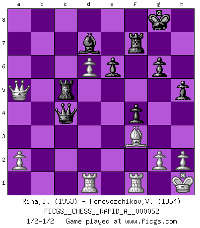 Last move : 1/2-1/2 2008 November 3 17:9:46 [Event "FICGS__CHESS__RAPID_A__000052"] [Site "FICGS"] [Date "2008.10.28"] [Round "1"] [White "Riha,Josef"] [Black "Perevozchikov,Vjacheslav"] [Result "1/2-1/2"] [WhiteElo "1953"] [BlackElo "1954"] 1.c4 Nf6 2.d4 g6 3.Nc3 d5 4.Nf3 Bg7 5.cxd5 Nxd5 6.e4 Nxc3 7.bxc3 c5 8.Rb1 O-O 9.Be2 Nc6 10.d5 Ne5 11.Nxe5 Bxe5 12.Qd2 e6 13.f4 Bg7 14.c4 Re8 15.e5 f6 16.d6 fxe5 17.Bb2 exf4 18.Bxg7 Kxg7 19.O-O Rf8 20.Rbd1 Bd7 21.Qb2+ Kg8 22.Qxb7 a5 23.Bg4 Rb8 24.Qa7 Rf7 25.Qxc5 Rc8 26.Qe5 Qb6+ 27.Kh1 Qc5 28.Qe1 Qxc4 29.Qxa5 h5 30.Bf3 Rc5 1/2-1/2 English, 1...Nf6 (Anglo-Indian defense) Kingside Castling by player Black (move 8) Kingside Castling by player White (move 19) This chess game ended in a draw. Follow this game move after move (download)He who takes the Queen's Knight's Pawn will sleep in the streets. (Anonymous) Ich könnte leicht behaupten: Ja,ja, Leonid Breschnew wollte nicht, daß ich Weltmeister werde. In der Tat war die Sache komplizierter. (Viktor Kortschnoi) Siempre es mucho mejor sacrificar las piezas de tu oponente. (Savielly Tartakover) C'est une question de caractère, Beaucoup de gens perdent leur motivation très vite. D'autres, ils sont rares, peuvent la conserver très longtemps. J'aime les échecs, encore aujourd'hui je suis heureux d'analyser des parties. J'aime toujours gagner, je déteste encore perdre. Bien jouer est important pour mon intégrité intellectuelle et morale. Et puis les échecs vivent en ce moment une période historique grâce à Internet. Ils se développent dans les systèmes éducatifs à travers le monde. Ils sortent de leur ghetto, et c'est mon rôle de mener à bien cette révolution. (Gary Kasparov) Perception is reality. (Immanuel Kant)
