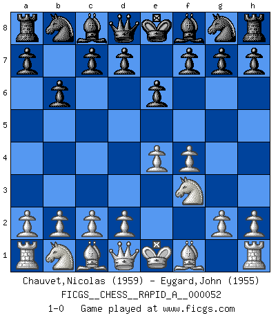 Last move : 1-0 2008 November 30 10:33:14 [Event "FICGS__CHESS__RAPID_A__000052"] [Site "FICGS"] [Date "2008.10.28"] [Round "1"] [White "Chauvet,Nicolas"] [Black "Eygard,John"] [Result "1-0"] [WhiteElo "1959"] [BlackElo "1955"] 1.f4 b6 2.e4 e6 3.Nf3 1-0 This chess game has been lost on time (started : 2008.10.28 13:50:53) Bird's Opening Player White won this chess game. Follow this game move after move (download)A bad day of Chess is better than any good day at work. (Anonymous) Wenn Du nicht kämpfst, um anderen etwas zu beweisen, sondern nur für Dich selbst, dann bist du fast unbesiegbar. (Garry Kasparov) ¿Quién es tu oponente esta tarde? Esta tarde mi oponente son las piezas negras. (Akiba Rubinstein) Tous ces prétendus hommes politiques sont les pions, les Cavaliers, les Tours ou les Fous d'une partie d'échecs qui se jouera tant qu'un hasard ne renversera pas l'échiquier. (Honoré de Balzac) Never was anything great achieved without danger. (Niccolo Machiavelli)