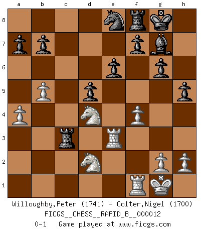Last move : 0-1 2006 September 15 23:28:4 [Event "FICGS__CHESS__RAPID_B__000012"] [Site "FICGS"] [Date "2006.08.16"] [Round "1"] [White "Willoughby,Peter"] [Black "Colter,Nigel"] [Result "0-1"] [WhiteElo "1741"] [BlackElo "1700"] 1.e4 e6 2.d4 d5 3.e5 c5 4.c3 Qb6 5.Nf3 Bd7 6.Be2 Bb5 7.O-O Bxe2 8.Qxe2 Qa6 9.Qxa6 Nxa6 10.Bg5 Ne7 11.Nbd2 Nc6 12.Be3 cxd4 13.Nxd4 Nxe5 14.f4 Ng4 15.Rae1 Nc7 16.b4 g6 17.N2f3 Nxe3 18.Rxe3 h5 19.Ne5 Bg7 20.a4 Rc8 21.b5 O-O 22.Nef3 Ne8 23.Nd2 Rxc3 0-1 French : Advance, Wade variation Kingside Castling by player White (move 7) Kingside Castling by player Black (move 21) Player Black won this chess game. Follow this game move after move (download)It is always better to sacrifice your opponent's men. (Savielly Tartakower) Ich habe die besten Aussichten, den ersten Preis zu gewinnen - denn jeder muss gegen Steinitz spielen, nur ich nicht! (Wilhelm Steinitz) En la perfecta combinación de Ajedrez como en una historia corta de primera clase, toda la trama y contra trama deberá conducir hacia un final sorprendente, el interes no es mitigado hasta el último momento. (Yates and Winter) On n'a jamais que l'âge auquel on a commence à jouer aux échecs car après on cesse de vieillir. (Capablanca) Beep ! (R2D2 in Star Wars ep.3)