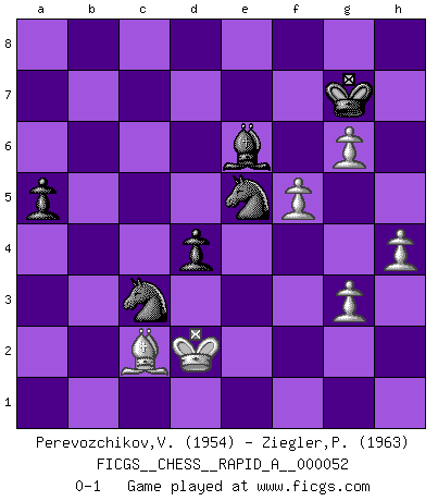 Last move : 0-1 2009 January 16 0:15:29 [Event "FICGS__CHESS__RAPID_A__000052"] [Site "FICGS"] [Date "2008.10.28"] [Round "1"] [White "Perevozchikov,Vjacheslav"] [Black "Ziegler,Pio"] [Result "0-1"] [WhiteElo "1954"] [BlackElo "1963"] 1.e4 e5 2.Nf3 Nc6 3.Bb5 a6 4.Ba4 Nf6 5.O-O Be7 6.Re1 b5 7.Bb3 d6 8.c3 O-O 9.h3 Bb7 10.d4 Re8 11.Nbd2 Bf8 12.a4 h6 13.Bc2 exd4 14.cxd4 Nb4 15.Bb1 c5 16.d5 Nd7 17.Ra3 f5 18.exf5 Bxd5 19.Rxe8 Qxe8 20.Nh4 bxa4 21.Ng6 Nf6 22.Rxa4 Qc6 23.Ra3 Re8 24.Rg3 Bf7 25.Nf1 Qb6 26.Bxh6 gxh6 27.Nxf8 Kxf8 28.Qd2 Ke7 29.Rg7 c4 30.Qxh6 Rg8 31.Rxg8 Nxg8 32.Qc1 Nc6 33.g4 Ne5 34.Ng3 Kf8 35.Ne4 Qd4 36.Kf1 d5 37.Nc3 Qb6 38.Qe3 Qd6 39.g5 Nc6 40.Qg3 Qxg3 41.fxg3 d4 42.Na4 Ne5 43.Be4 Ne7 44.Nc5 a5 45.h4 Nd5 46.Ke1 Bg8 47.Kd2 c3+ 48.bxc3 Nxc3 49.Bc2 Bc4 50.g6 Kg7 51.Ne6+ Bxe6 0-1 Ruy Lopez : Closed Kingside Castling by player White (move 5) Kingside Castling by player Black (move 8) Player Black won this chess game. Follow this game move after move (download)Kasparov : J'adoube , Ivanchuk : S'il vous plaît ! (Garry Kasparov & Vassily Ivanchuk, Linares 1997) Die meiste Zeit treffe ich auf Gegner, die meine Enkel sein könnten. Ich bin da, um ihnen zu zeigen, dass sie von mir noch einiges lernen können. (Viktor Kortschnoi) El Ajedrez es una hermosa aventura. (Bent Larsen) D'abord les bases : Jouez et étudiez, puis étudiez et jouez, ensuite jouez et étudiez, puis étudiez et jouez. Deuxièmement : Donnez toujours le meilleur de vous-même ! (Ken Smith) If we knew what we were doing, we would not call it research. (Albert Einstein)