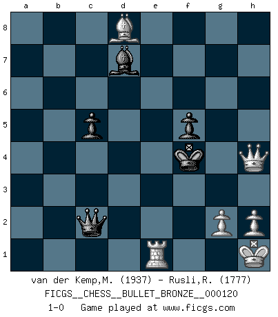 Last move : 1-0 2009 June 11 21:37:2 [Event "FICGS__CHESS__BULLET_BRONZE__000120"] [Site "FICGS"] [Date "2009.06.11"] [Round "1"] [White "van der Kemp,Michel"] [Black "Rusli,Rafnizar"] [Result "1-0"] [WhiteElo "1937"] [BlackElo "1777"] 1.e4 c5 2.Nf3 Nc6 3.d4 cxd4 4.Nxd4 e5 5.Nb3 Nf6 6.Nc3 Bb4 7.Bd3 d5 8.O-O Bxc3 9.exd5 Nxd5 10.bxc3 Nxc3 11.Qe1 Nd5 12.Ba3 Qg5 13.Be4 Nf4 14.Kh1 Be6 15.Bd6 f5 16.Bxc6+ bxc6 17.Rg1 O-O-O 18.Bxe5 Nh3 19.Qe2 Nxg1 20.Qa6+ Kd7 21.Nc5+ Ke7 22.Qxa7+ Rd7 23.Nxd7 Bxd7 24.f4 Qh5 25.Rxg1 Re8 26.a4 g5 27.fxg5 Qxg5 28.a5 Qd2 29.a6 Ke6 30.Qc7 Rc8 31.a7 Rxc7 32.Bxc7 c5 33.a8Q Qxc2 34.Re1+ Kf7 35.Qd5+ Kg6 36.Qg8+ Kh5 37.Qxh7+ Kg5 38.Bd8+ Kf4 39.Qh4+ 1-0 Sicilian : Labourdonnais-Loewenthal variation Kingside Castling by player White (move 8) Queenside Castling by player Black (move 17) Promotion Queen by player White (move 33) Player White won this chess game. Follow this game move after move (download)Some sacrifices are sound; the rest are mine. (Mikhail Tal) Du musst nicht gut spielen, es reicht, wenn du besser spielst als dein Gegner. (Anonymous) Todo se encuentra en un estado de flujo y esto incluye al mundo del Ajedrez. (Mikhail Botvinnik) Les Echecs sont affaire de jugement sensible. Savoir quand frapper et quand esquiver. (Fischer) . 'gn is not allowed in chess unless n is an integer between 1 and 8 inclusive, where 1 and 8 are to interpreted as the standard numerals standing for integers in the ordered real-closed field R, with the *canonical* ordering. (As opposed to, say, an integer in the domain Z[2+i*sqrt(5)] or an integer in some exotic Grothendieck topos). (Normajean Yates)