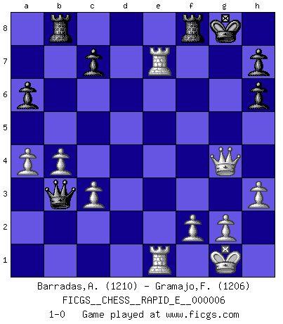 Last move : 1-0 2008 November 5 19:5:58 [Event "FICGS__CHESS__RAPID_E__000006"] [Site "FICGS"] [Date "2008.10.30"] [Round "1"] [White "Barradas,Anderson"] [Black "Gramajo,Francisco"] [Result "1-0"] [WhiteElo "1210"] [BlackElo "1206"] 1.e4 Nc6 2.Nf3 e5 3.Bb5 Nge7 4.c3 d6 5.O-O a6 6.Ba4 b5 7.Bb3 b4 8.Re1 bxc3 9.dxc3 Bg4 10.h3 Bh5 11.Bc4 Qd7 12.Bg5 Bg6 13.Bxe7 Bxe7 14.Bd5 Rb8 15.b4 O-O 16.Nbd2 Nd8 17.Qb3 Ne6 18.Bxe6 fxe6 19.a4 d5 20.exd5 exd5 21.Nxe5 Qf5 22.Qxd5+ Bf7 23.Qf3 Qc2 24.Nxf7 Qxd2 25.Rxe7 Qb2 26.Rae1 Qb3 27.Nh6+ gxh6 28.Qg4+ 1-0 KP : Nimzovich defense Kingside Castling by player White (move 5) Kingside Castling by player Black (move 15) Player White won this chess game. Follow this game move after move (download)Chess, like any creative activity, can exist only through the combined efforts of those who have creative talent, and those who have the ability to organize their creative work. (Mikhail Botvinnik) Frage des Reporters: -Welche besonderen Umstände rechtfertigen das Anhalten der Uhren während einer Turnierpartie? Antwort: -Einen Fotographen zu strangulieren. (Siegbert Tarrasch) Un Peón pasado aumenta su poder a medida de que el número de piezas en el tablero disminuye. (Capablanca) Toutes les manuvres exécutées sur une colonne ouverte ont pour but ultime l'intrusion définitive sur la septième ou la huitième rangée, en plein cur de la position ennemie. (Aaron Nimzovitch) Thibault, I ask for draw. Game 13876. - Sorry Ilmars, you won. (FICGS chat)