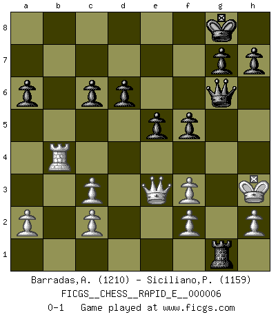Last move : 0-1 2008 November 28 18:4:23 [Event "FICGS__CHESS__RAPID_E__000006"] [Site "FICGS"] [Date "2008.10.30"] [Round "1"] [White "Barradas,Anderson"] [Black "Siciliano,Pablo"] [Result "0-1"] [WhiteElo "1210"] [BlackElo "1159"] 1.e4 c5 2.Nf3 Nc6 3.d4 cxd4 4.Nxd4 Nf6 5.Nc3 e5 6.Nf3 Bb4 7.Bd2 Bxc3 8.Bxc3 Nxe4 9.Bb5 Nxc3 10.bxc3 O-O 11.O-O d6 12.Rb1 Qc7 13.Re1 Bg4 14.Re4 f5 15.Rc4 a6 16.Bxc6 bxc6 17.Qe1 Bxf3 18.gxf3 Rab8 19.Rxb8 Rxb8 20.Qe3 Rb1+ 21.Kg2 Qf7 22.Rb4 Qg6+ 23.Kh3 Rg1 0-1 Sicilian : Pelikan (Lasker/Sveshnikov) variation Kingside Castling by player Black (move 10) Kingside Castling by player White (move 11) Player Black won this chess game. Follow this game move after move (download)You sit at the board and suddenly your heart leaps. Your hand trembles to pick up the piece and move it. But what Chess teaches you is that you must sit there calmly and think about whether it's really a good idea and whether there are other better ideas. (Stanley Kubrick) Alle Schachspieler sollten auch ein Hobby haben. (Savielly Grigorievitsch Tartakower) No hay precio que sea tan grande por la cabellera del Rey enemigo. (Koblentz) Ce qui caractérise les parties de combat, c'est que si le défenseur a constamment de difficiles problèmes à résoudre, l'attaquant doit chercher sans relâche de nouvelles possibilités d'attaque. (Koblentz) The various flowers seem good to different people. (Chinese proverb)
